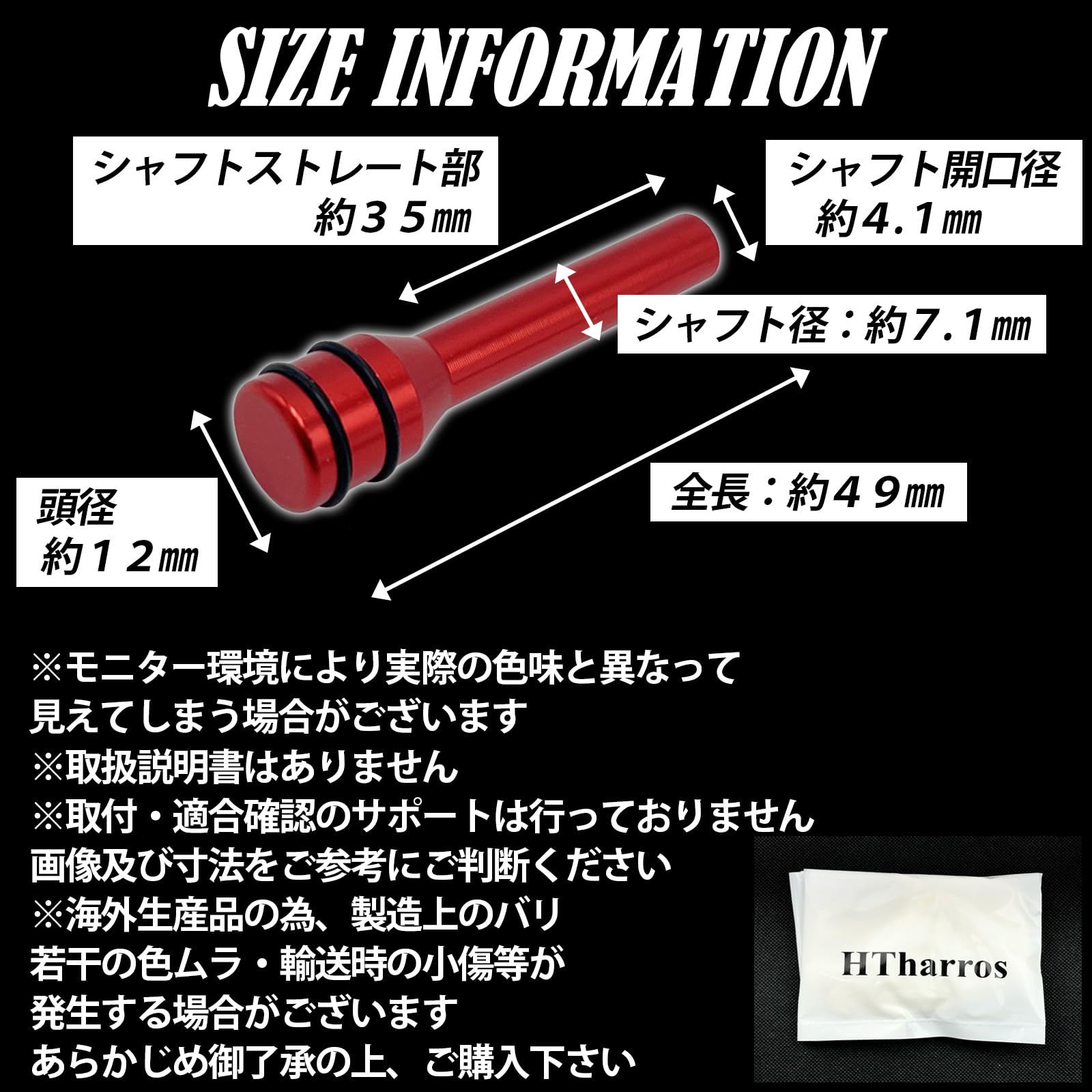 【材質】アルミニウム合金 【寸法】全長:49MM(シャフト部38MM)頭径:φ12MM。シャフト部:外径7.1MM、内径φ4.4MM