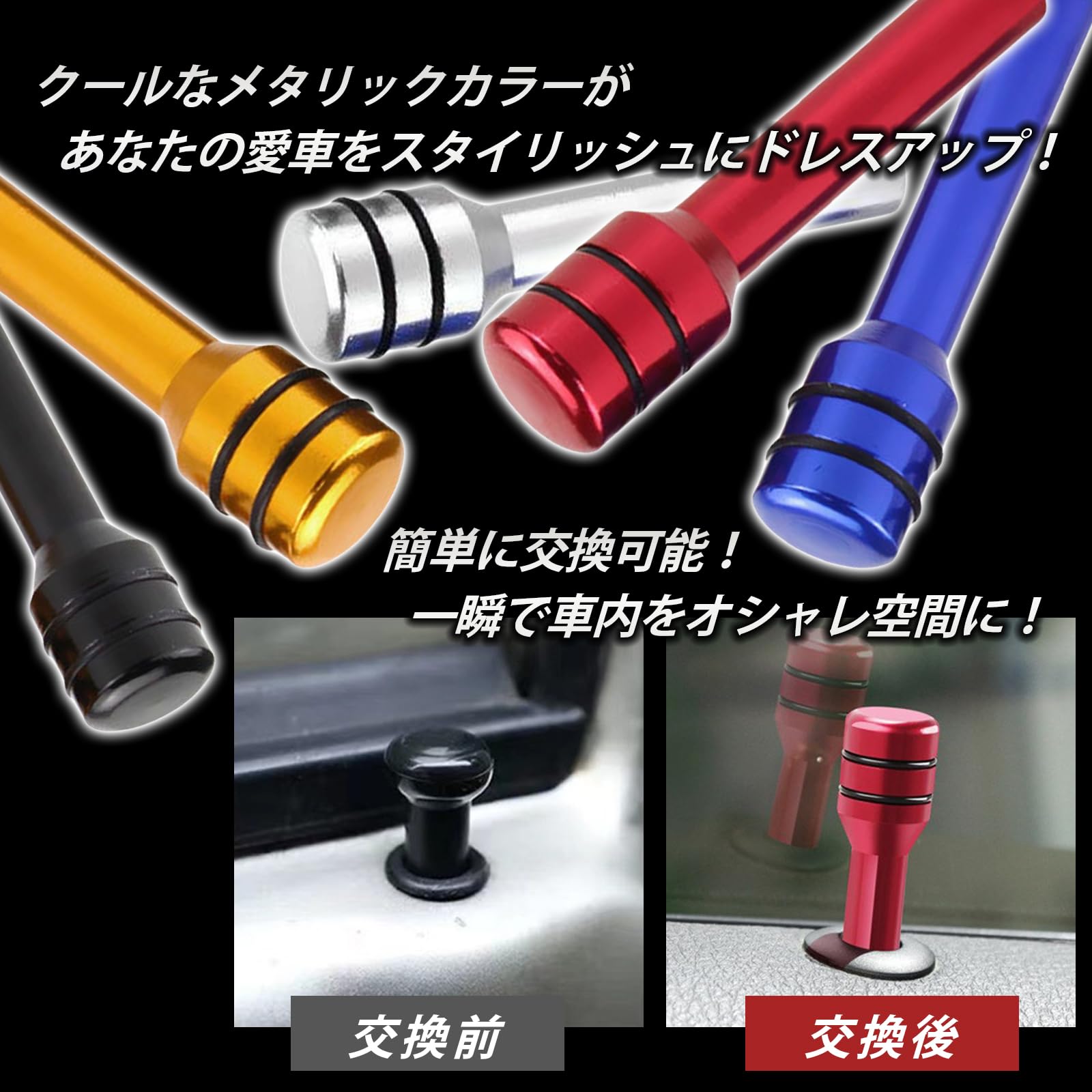 ドアロックノブピンはピン形状(棒状)のお車に交換装着可能、実用的なシンプルなデザインで車内をカスタム。