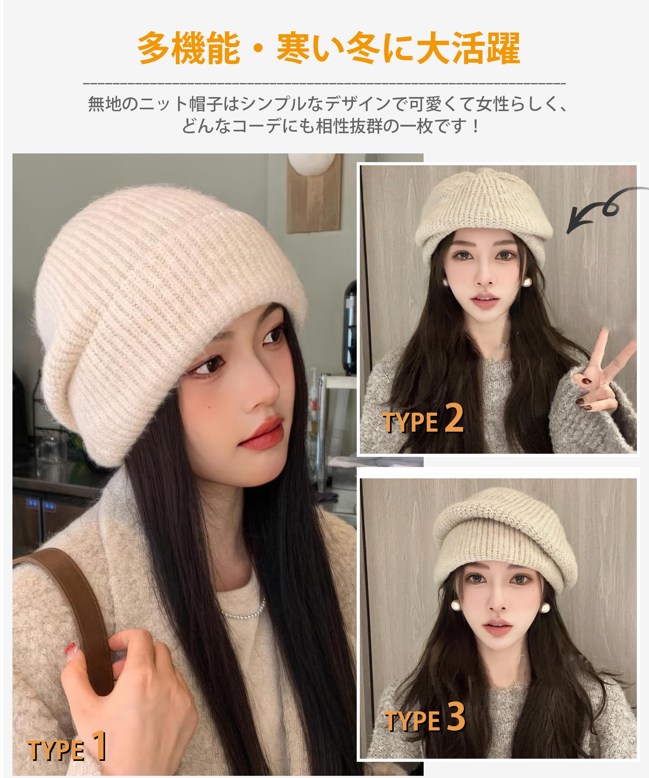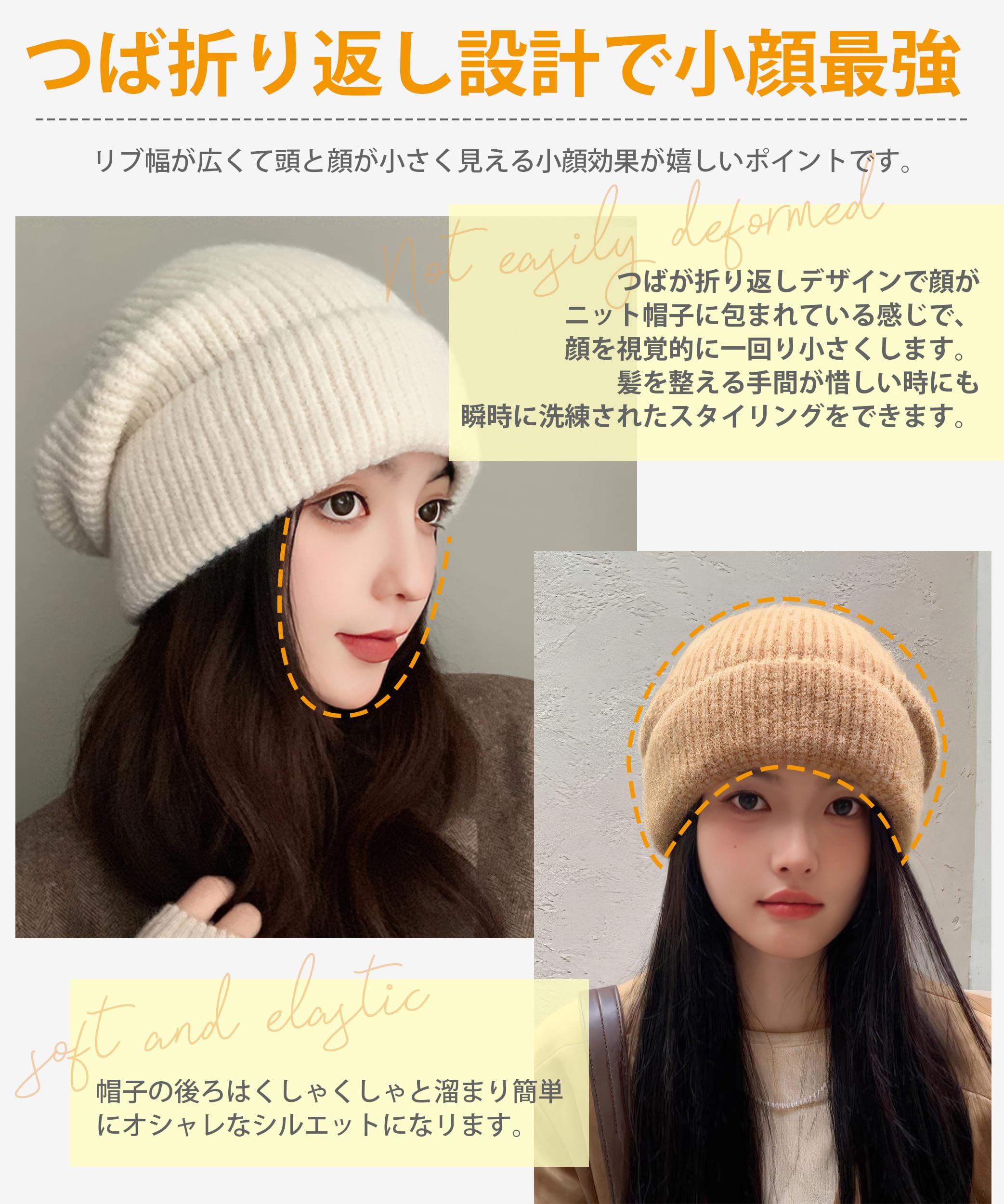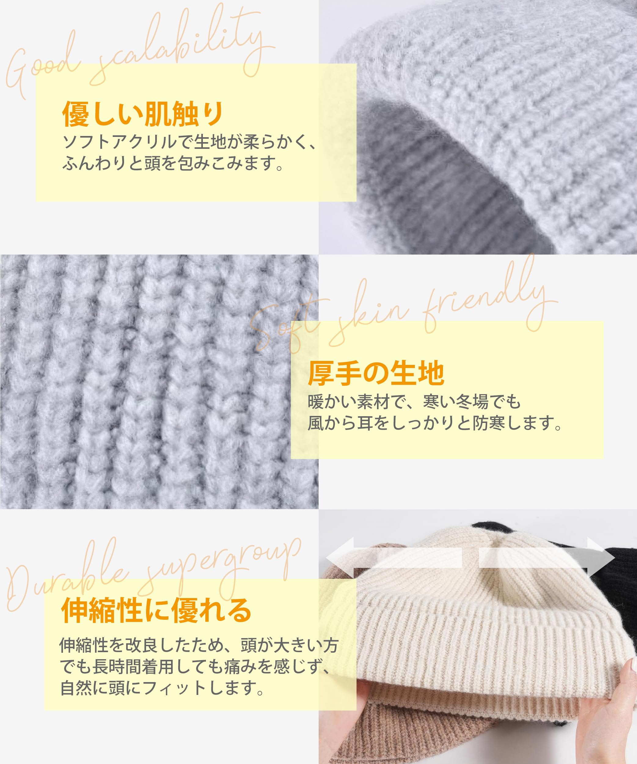 ??【大きいサイズの声への対応】ニット帽は頭周りに55-62cmのフリーサイズにして、大きいサイズの声にしっかりと応えました。ニット帽は厚手の生地でいながら伸縮性に優れているため、頭部への締め付けや圧迫感を感じにくいです。ゆったりとしたニット帽子、頭が大きい方でも長時間着用しても痛みを感じず、自然に頭にフィットします。大きい頭囲の方にとっての究極の選択です!大きめデザインのレディースニット帽子はカジュアルでもきれいめでもOKの秋冬には欠かせないマストアイテム。