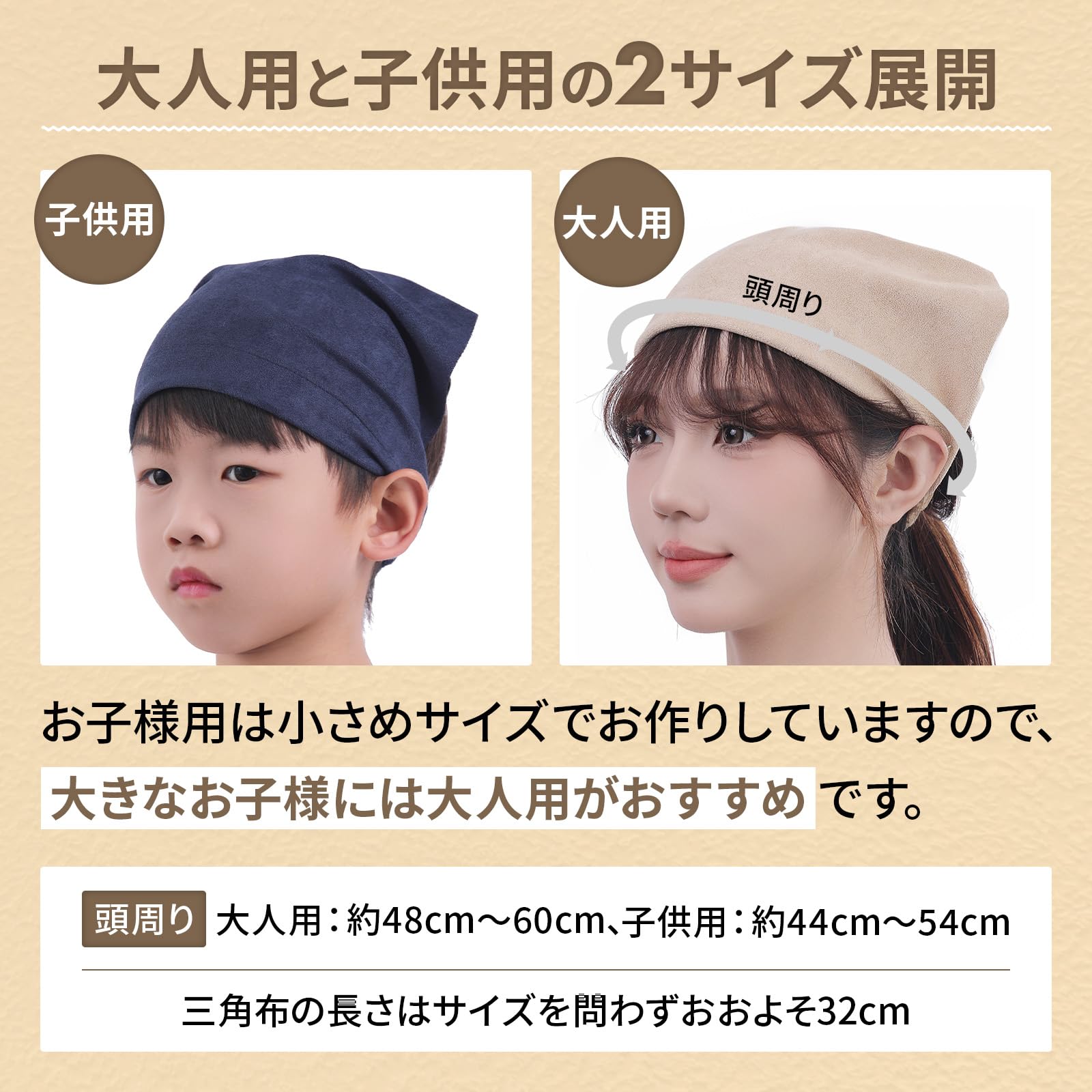 【サイズ】大人用:頭周り約48cm〜60cm用/三角布の長さ約32cm、子供用約44cm〜54cm用/三角布の長さ約32cm。