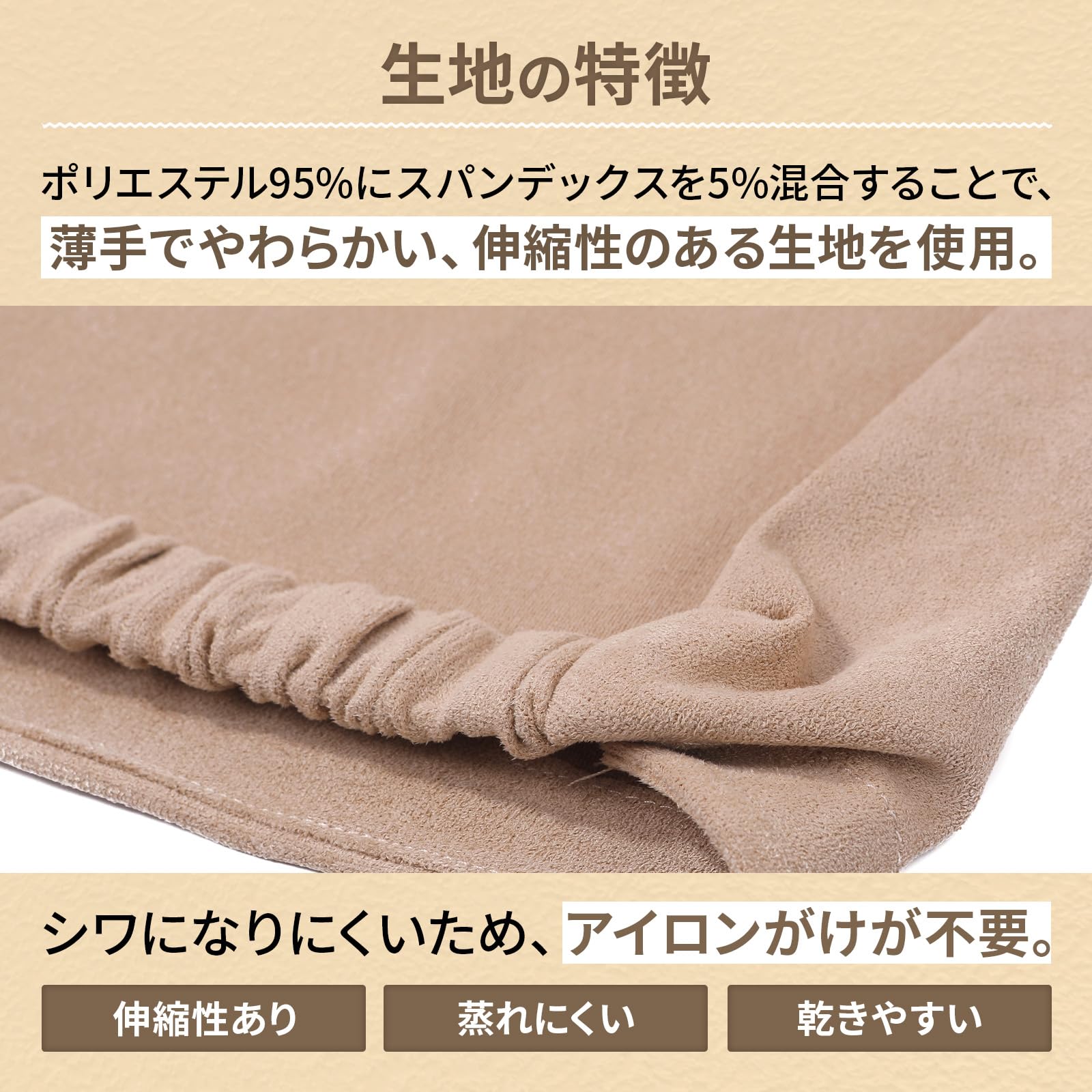 【シワになりにくい】ポリエステルにスパンデックスを5%混合することで、スウェードのような薄手のやわらかい質感です。洗濯をしてもシワになりにくいためアイロンがけは不要です。