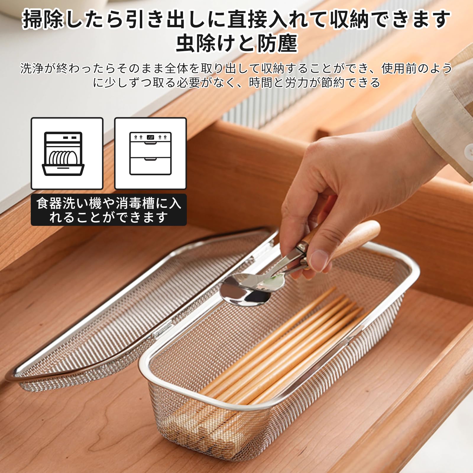 【カトラリーの整理に最適】スプーンやフォーク、箸などを種類別に整理できる収納バスケット。キッチンの収納力を高め、探す手間を省き、調理や配膳の効率もアップします。