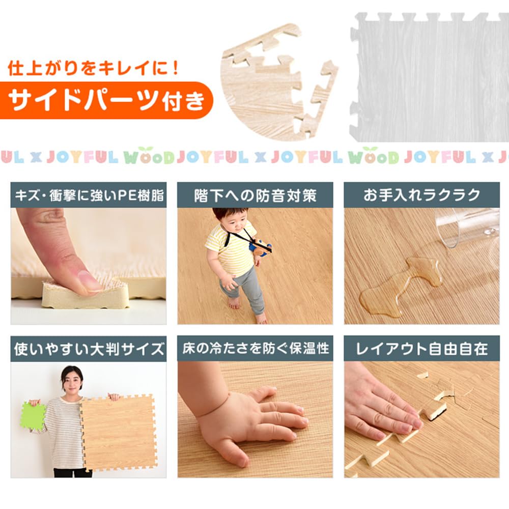 ※商品の仕様上、ジョイント部分(サイドパーツ含む)の木目の柄は合わない場合がございます。※PE素材の特性上、使用するうちに負荷がかかる部分に多少のへたりが生じる場合がございます。そのため、既に使用しているマットに新しいマットを繋げて使用する際、上手く繋がらない場合もございますので、予めご了承ください。※ノンワックスタイプの床材やコーティングの種類により、白色系の床材が黄色に変色することがあります。白色系の床でのご使用は避けてください。※2020年1月29日より59cmタイプのみの販売ページとなりました。2020年1月29日以前にお買い上げいただいた60cmタイプの製品とは接続できません。また、PE樹脂に抗菌・防臭加工を施し、表面の凹凸の形状を変更、裏面を凹凸のないフラットタイプへ変更しました。旧仕様の凹凸タイプとすべりにくさは変わりありません。