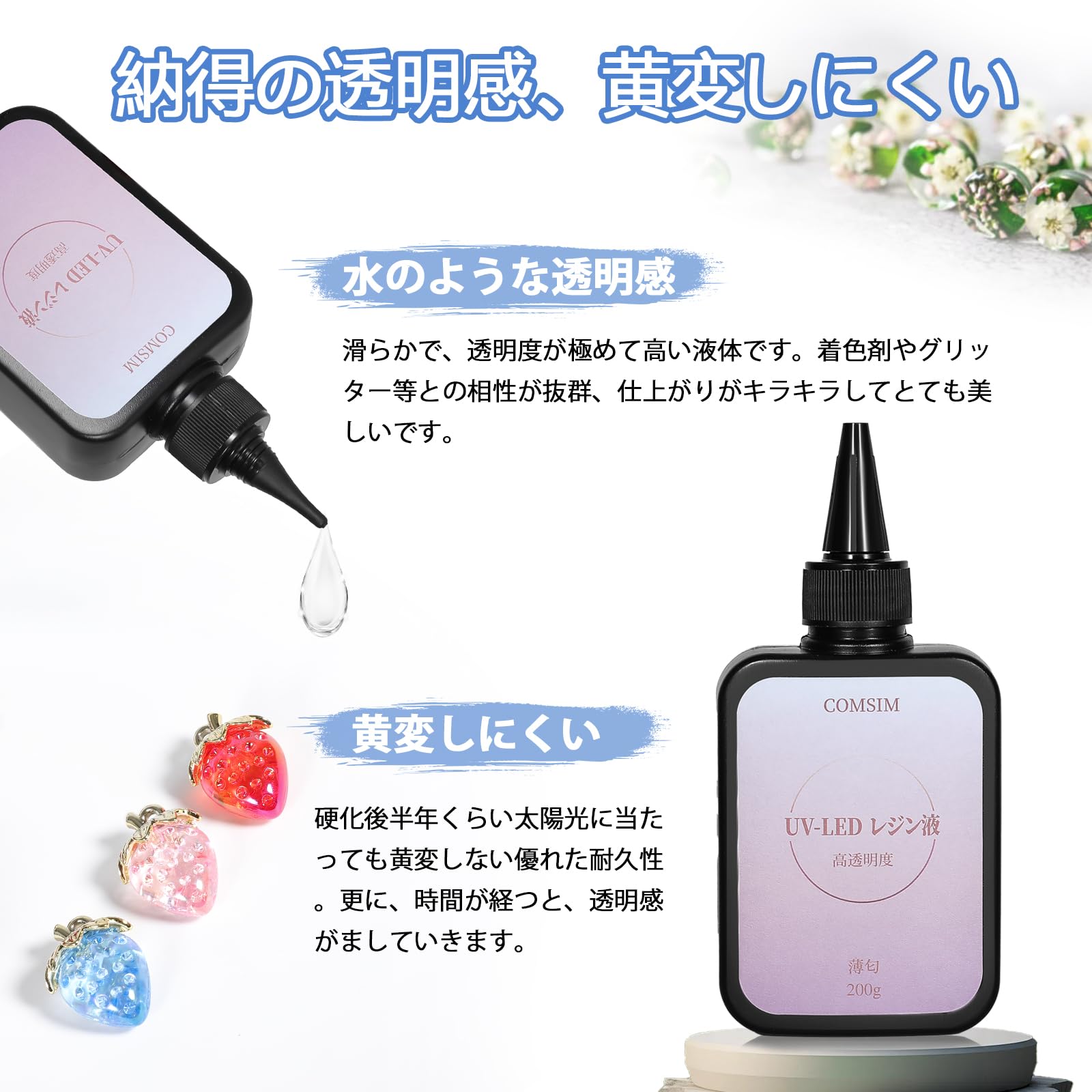 【UV-LED対応・素早い硬化】COMSIM UVレジン液はUVランプやLEDランプと組み合わせて使用でき、硬化時間が短く、高温に弱く、日光で簡単に硬化できます。手にベタつかず、すぐに次のプロセスに入ることができます。完璧なデザインの尖った先端は、気泡が発生しにくく、プロやDIY初心者でも簡単に使用できます。