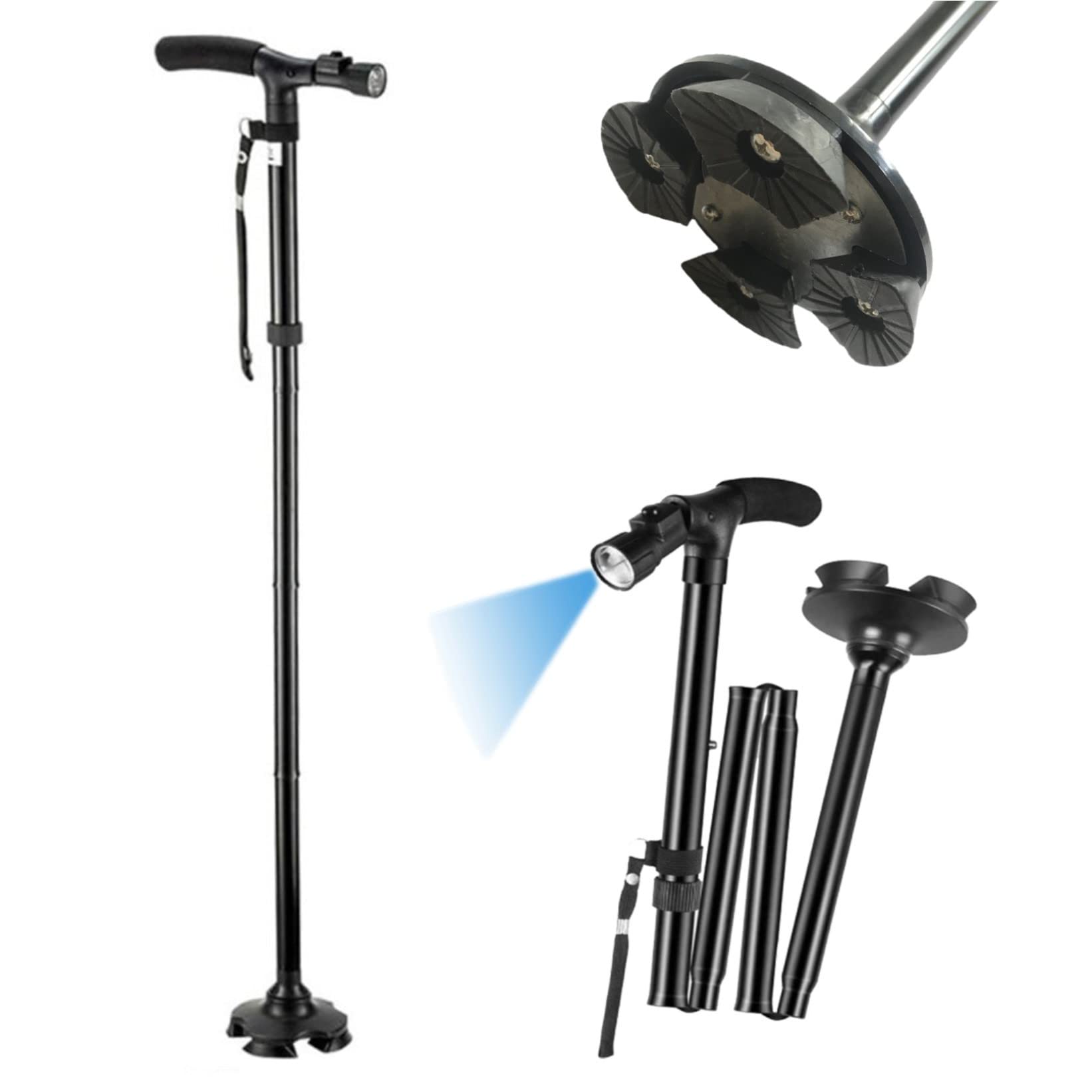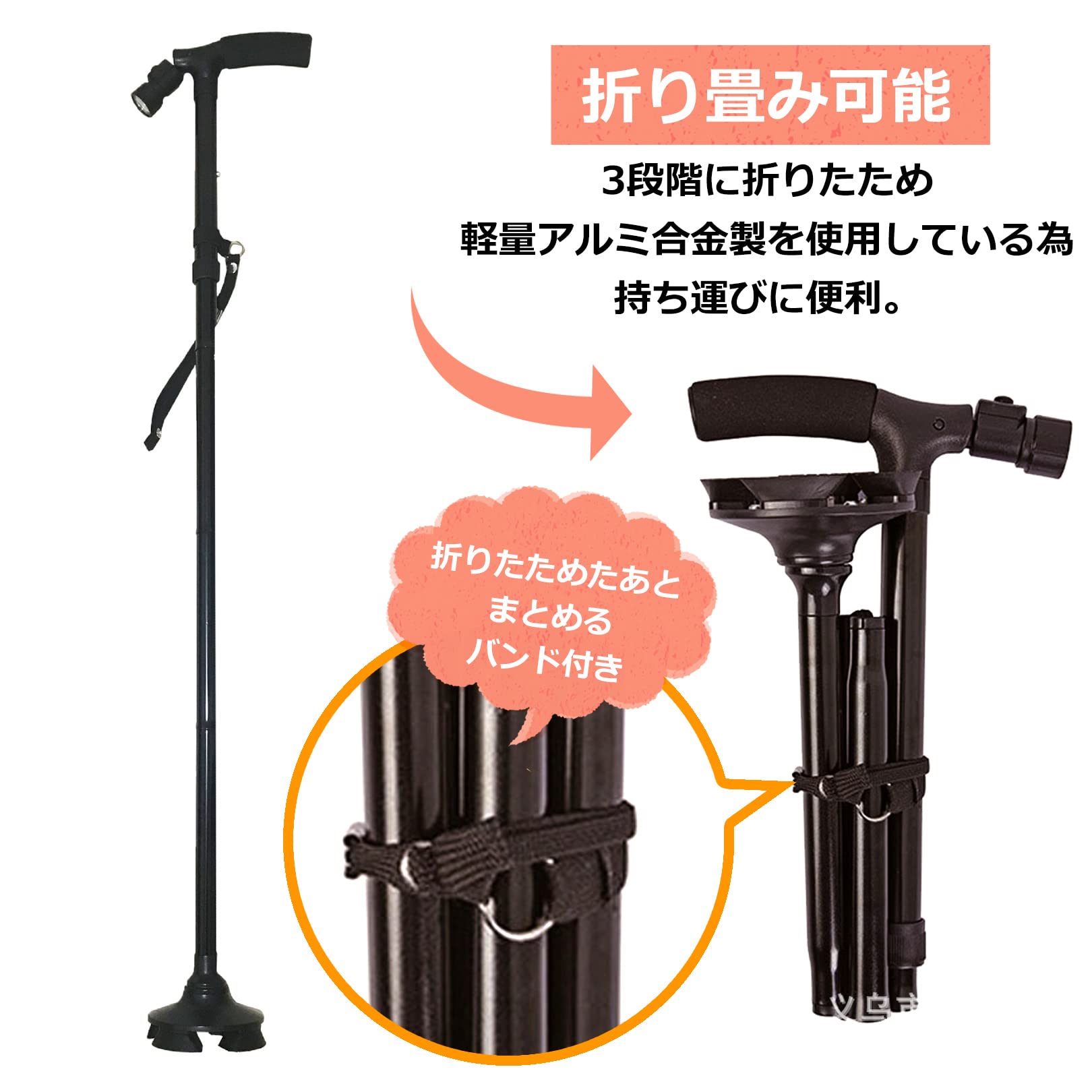 【人気】PIENSE ステッキ 杖 折りたたみ 自立式 LEDライト付き 介護用品 歩行器 高齢者用 4本足
