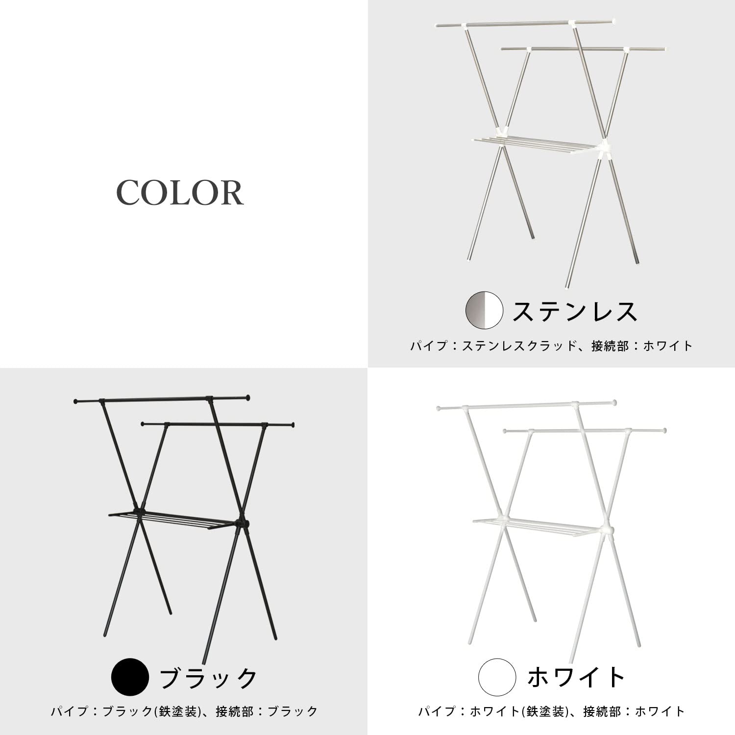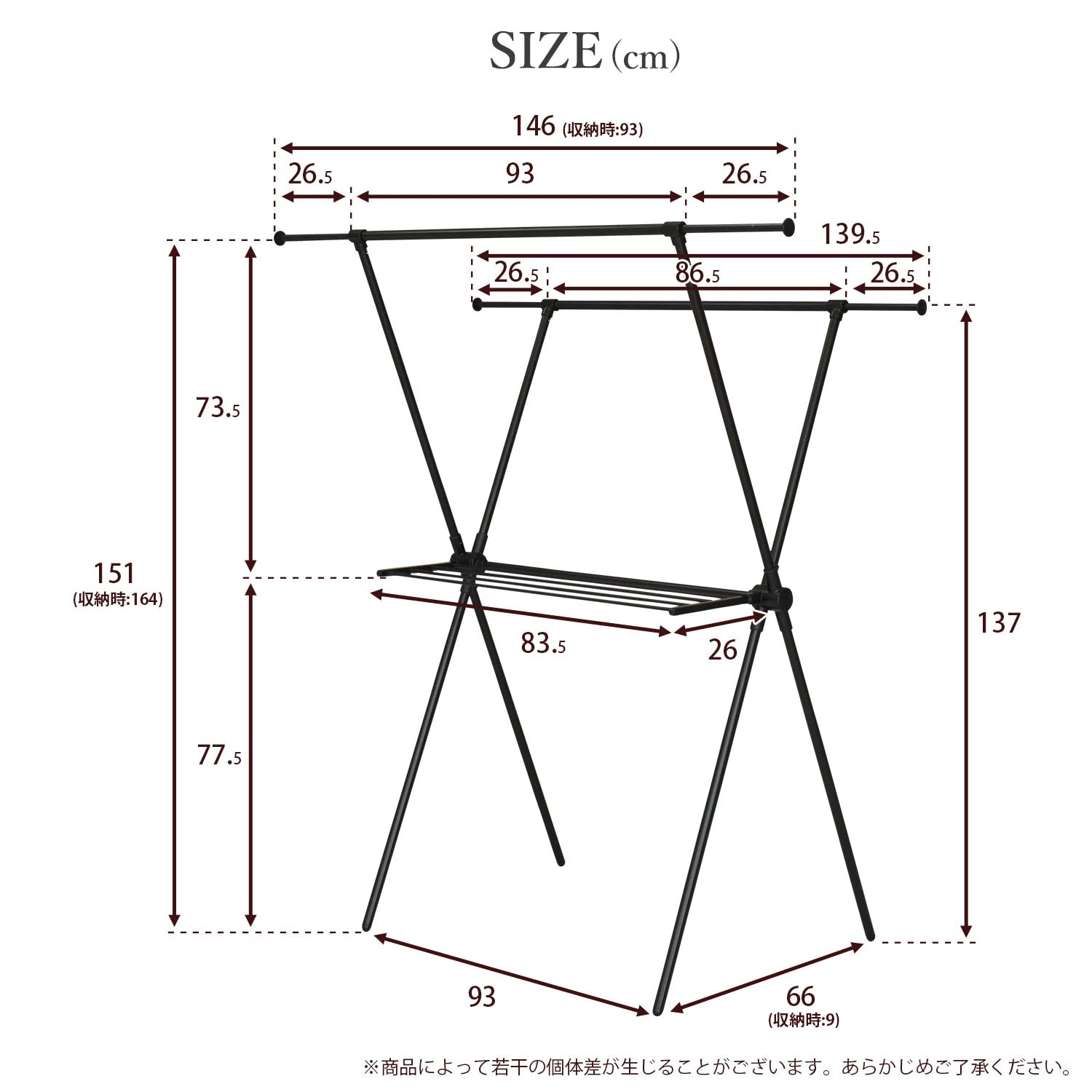 ekans(エカンズ) 室内物干し X型 (ブラック, レギュラーサイズ) 洗濯物干しの定番X型の物干しスタンドです ●パイプをさし込むだけの簡単組立(工具不要) ●倒れにくく頑丈な安定設計 ●2本のバーでたっぷり干せる ●軽くて移動もラクラク ●折りたたんでコンパクト収納 ●バスタオルも干せるワイドハンガー付き 耐荷重量:全体 約14kg ・上パイプ1本:約5kg(計10kg) ※上パイプの伸縮部分は約0.5kg ・タオルハンガーパイプ1本:約0.5kg(計2kg)