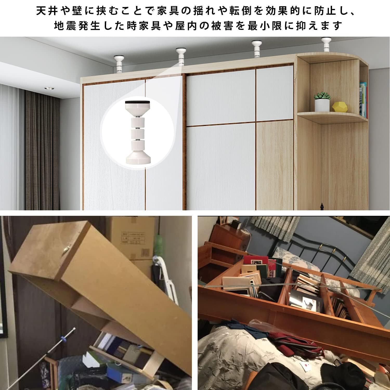 「家具転倒防止突っ張り棒」家具用転倒防止つっぱり棒ホワイト2本セットです。地震発生時家具の揺れや転倒を予防するための役割がします。ベッド、タンス、テーブル、本棚、食器棚、冷蔵庫など広い場所に使われています。天井や壁に挟むことで家具の転倒を効果的に防止し、地震発生した時家具や屋内の被害を最小限に抑える防災グッズです。