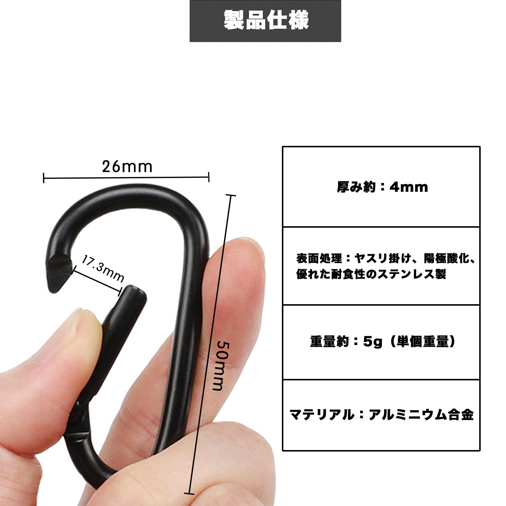 【材質 】航空アルミニウム合金、一つごとわずか5g超軽量。 表面処理:陽極酸化処理、耐候性。錆が出ない、安全で信頼できます。雨の中でも自由に使えます。