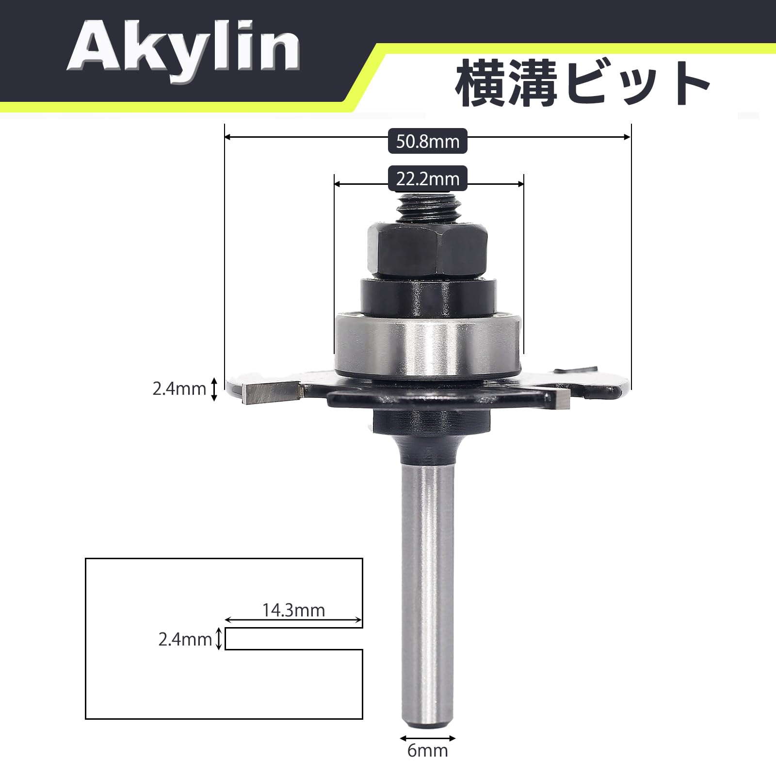 Akylin 横溝ビット T型 4枚刃 トリマービット 6mm軸 ベアリング付き スロットカッター ジョイントカッター 超硬刃 ルータービット切削深さ14.3MM 溝掘り 溝ビット 木工用 (刃長2.4mm)