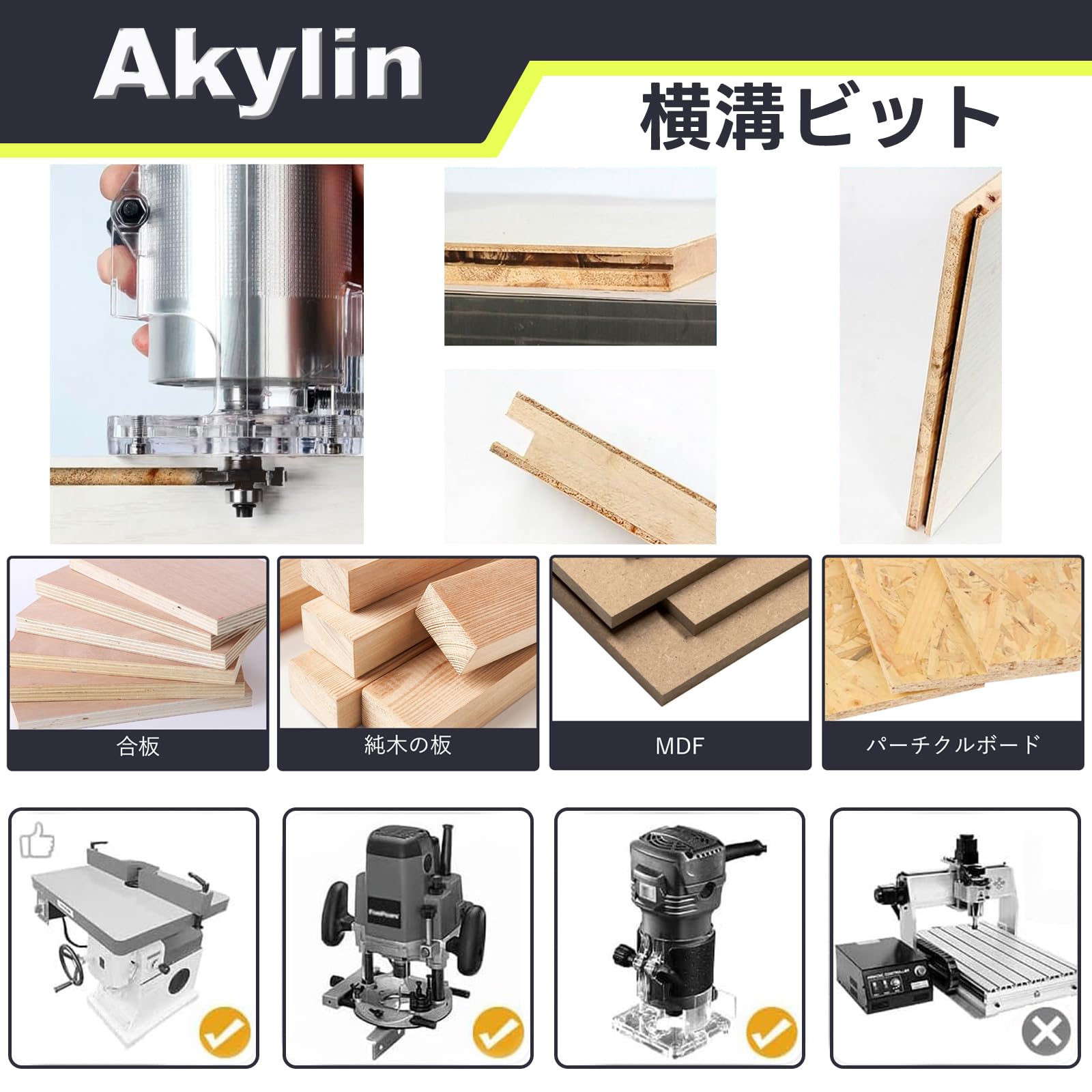 【対象範囲】6mmチャックのトリマー、ルーター適用します。また、トリマーテーブルやルーターテーブルを使い、溝が正確で安定した加工できます。木材・MDF・ラミネート・合板など木材に適応します。