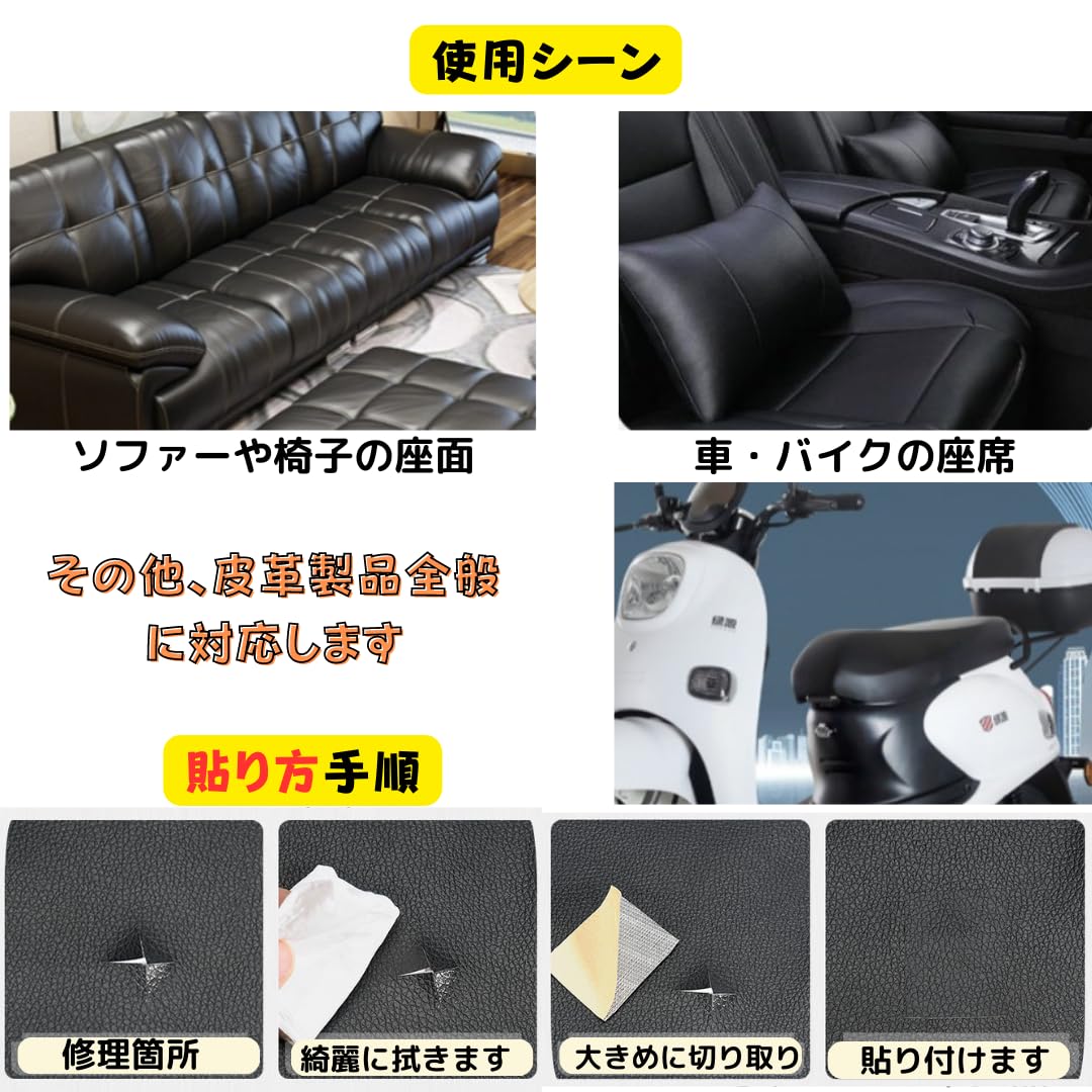 【フェイクレザー 生地 粘着テープ付】はがして貼るだけ、補修用 レザーシート。誰でも簡単に補修ができます。柔らかいのでハサミで楽々カット可能。ソファー破れの補修。車・バイクの座席破れ。椅子・カバン・靴の補修などに最適な合成皮革 補修シートです。皮革製品全般に対応可能。(表面にフッ素・シリコンなど特殊加工されているものや凹凸がある素材は?がれやすくなります)