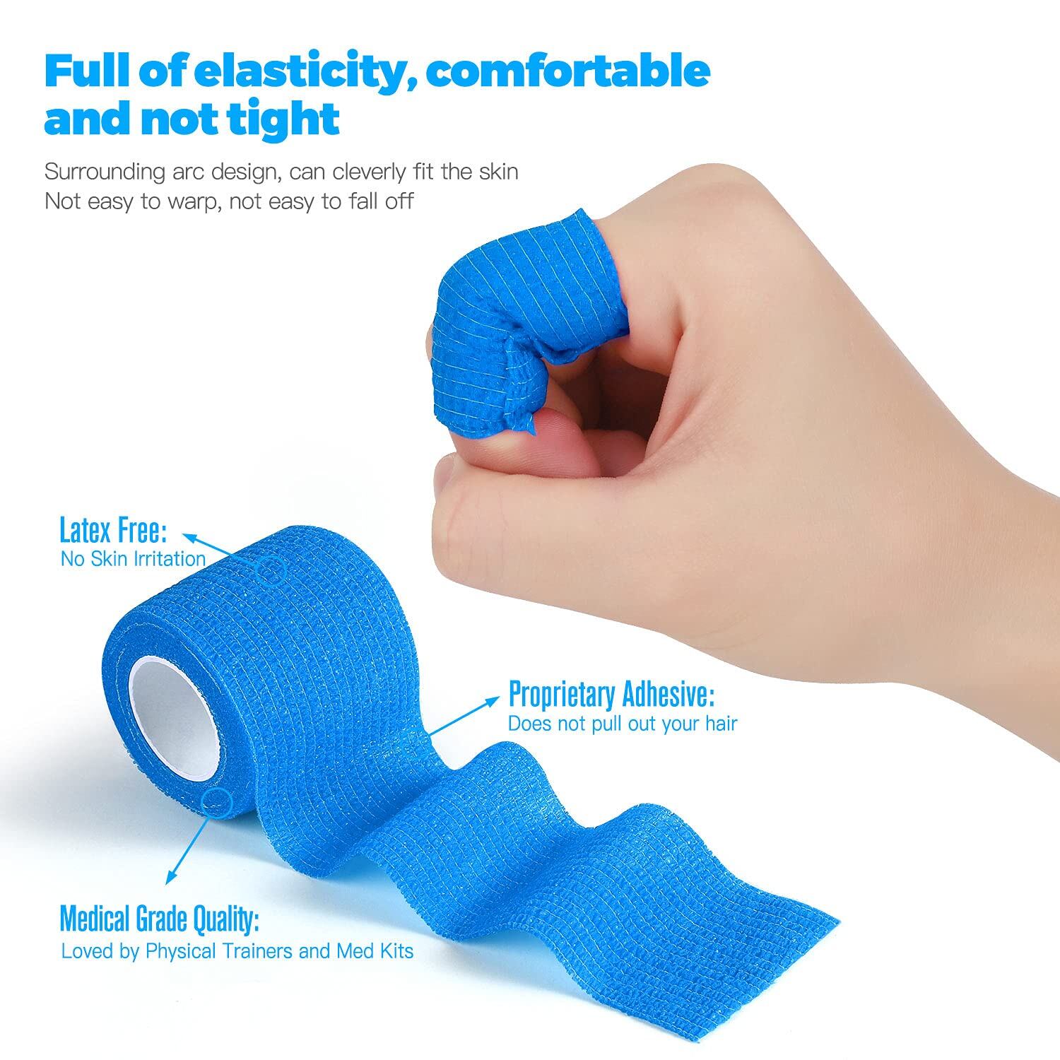 【耐水性&通気性】:このテーピングテープは不織布の素材を採用して、伸縮性、 通気性と自己接着性,水や汗によるゆるみなし。また、ドレッシング後、皮膚は空気と十分に接触できるし、汗や水分が蒸発しやすいし、良好な換気および発汗作用があります。自着性テープ は互いに張り付いていますが、皮膚、毛髪には付着しません。