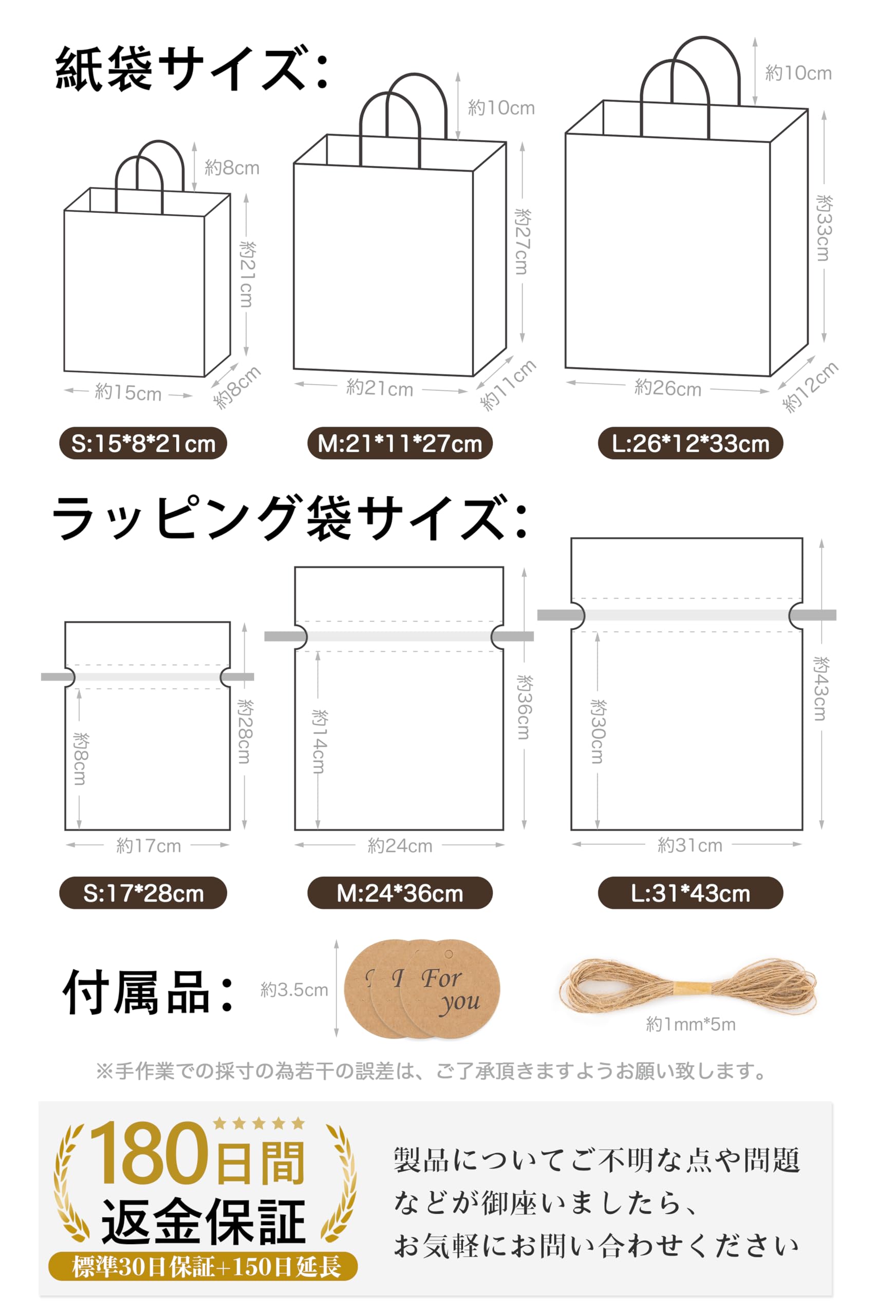 【セット内容】セットをご用意しております。Lセット:3枚ラッピング袋(3色):高さ31*幅43㎝、3枚紙袋(3色):26*12*33cm。Mセット:5枚ラッピング袋(5色):高さ24*幅36㎝、5枚紙袋(5色): 21*11*27cm。Sセット:6枚ラッピング袋(6色):高さ17*幅28㎝、6枚紙袋(6色): 15*8*21cm。S+M+Lセット:1枚Lサイズ(ラッピング袋+紙袋:1色)、1枚Mサイズ(ラッピング袋+紙袋:1色)、1枚Sサイズ(ラッピング袋+紙袋:1色)