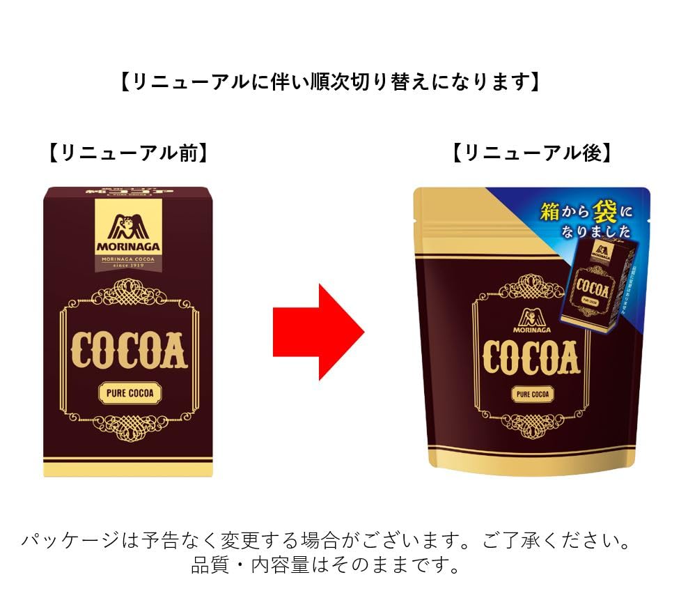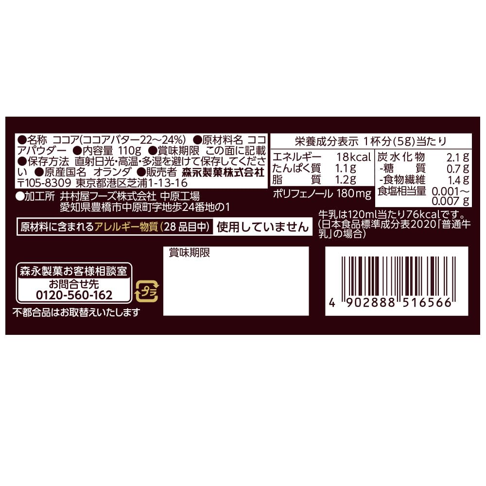 森永乳業 森永製菓 粉末 純ココア 1個 (x 3) 内容量:110g *3 パッケージ重量:約400g カカオ豆を使用した100%ピュアココアです。 カカオ豆を使用した100%ピュアココアです。 原材料・成分 ココアパウダー