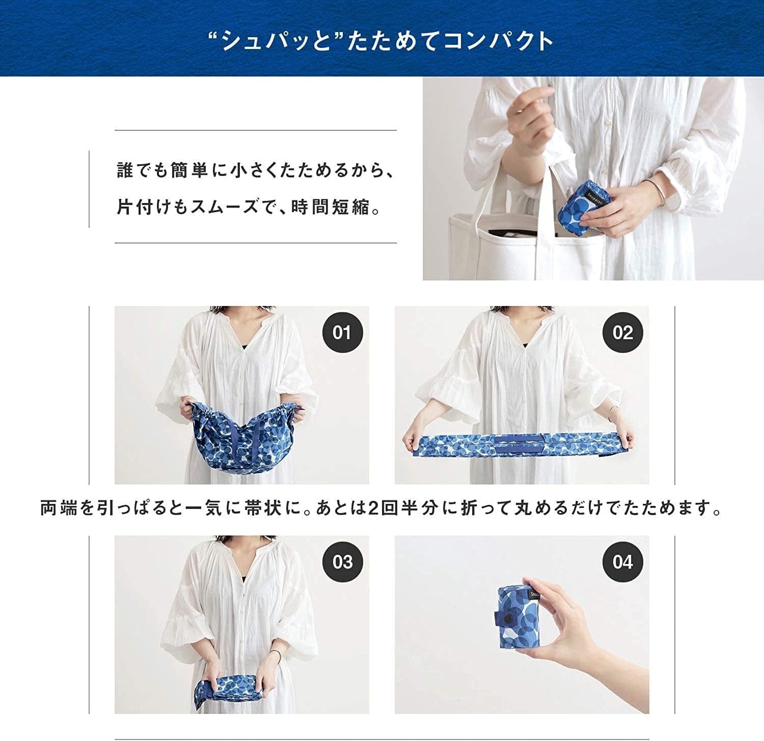 【シュパッとキレイにたためるエコバッグ】全体をサイズアップし、レジかごをすっぽり覆って余裕をもって掛けられるサイズになりました。また、薄手の生地へ変更したことで、さらにすっきりとコンパクトに、より持ち運びやすくなりました。
