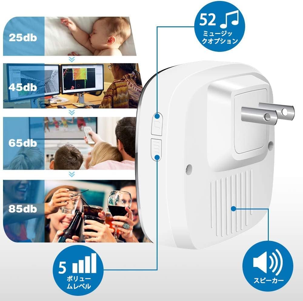 ワイヤレスチャイム 玄関チャイム インターホン 呼び出しチャイムセット 4段階音量調節 52曲選択 防水防塵 ドアベル 介護呼び鈴 最高280M無線範囲 送信機1個 受信機2個