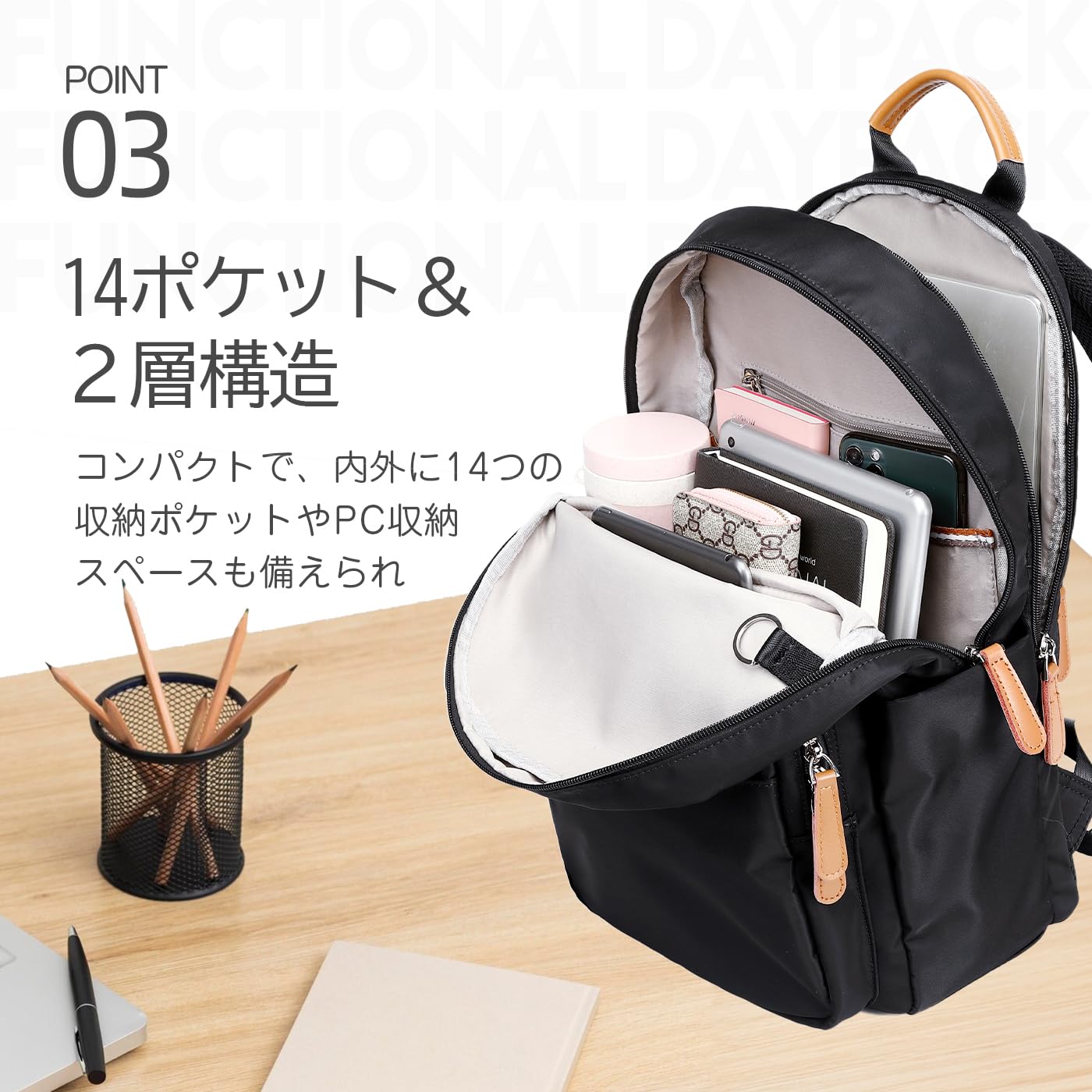 [PAOIXEEL] 2層構造 14ポケット リュック レディース メンズ A4 大容量 PCリュック 通学 通勤 大人 おしゃれ 防水 軽量 ナイロン 背面ファスナー 外出 アウトドア 男女兼用 リュックサック バックパック マザーズリュック