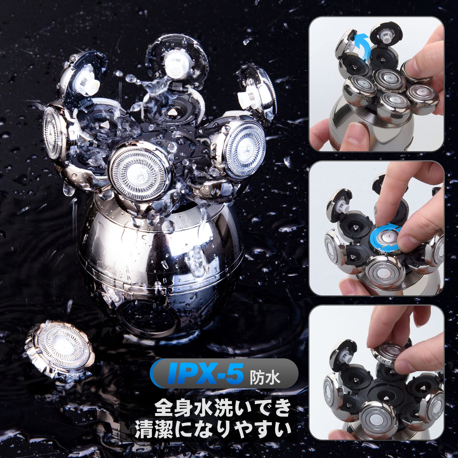 【ウェット&ドライシェーバー&IPX5防水】強力防水スキンヘッド用シェーバーなので、お風呂中も泡や水で剃れます。スキンヘッド用シェーバーをクリーニング時はシェーバーヘッドを開いて付属のクリーニングブラシで洗ってください。直接水で流れるもできます。人間工学に基づいたスキンヘッド シェーバーは扱いやすく、クリーニングも楽です