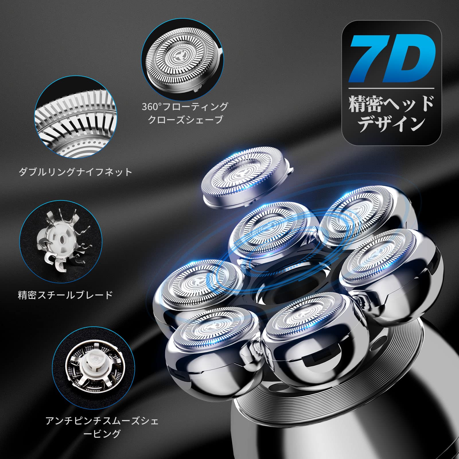 【7つ柔軟なロータリーシェーバーヘッド】スキンヘッド シェーバーは新型7つロータリーブレードの設計で、シェービング面積が拡大し、カミソリ時間が節約されます。スキンヘッド用シェーバーは7Dロータリーシェーバーヘッドを持ち、頭、顔、首、顎のすべての方向の輪郭にピッタリ。360度の回転刃は髪をすばやく取り除くことができ、よりスムーズな快適な徹底的なシェービング体験を提供します。替刃: B0DXTLY67X