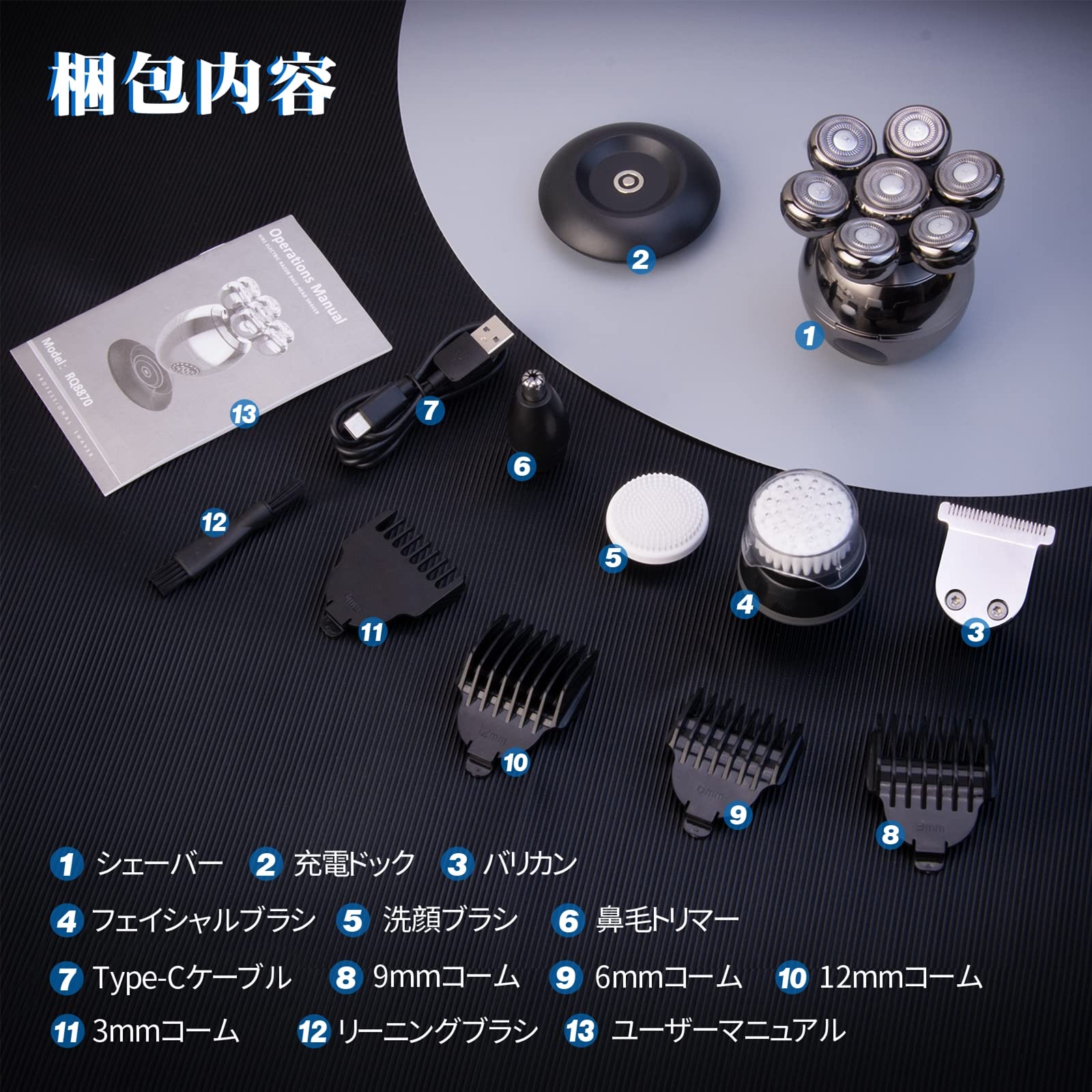 【6-in-1多機能電動シェーバー】回転式ひげそり スキンヘッド用シェーバー は取り外し可能な実用的なアクセサリーが付属:ロータリーシェーバー、バリカン、鼻毛トリマー、フェイシャルブラシ、洗顔ブラシ、クリーニングブラシ。また4つサイズのリミットコーム(6 mm / 9 mm / 12 mm/ 13 mm)を追加してます。日常すべてのニーズに合うひげそり 電動 スキンヘッド用シェーバーです