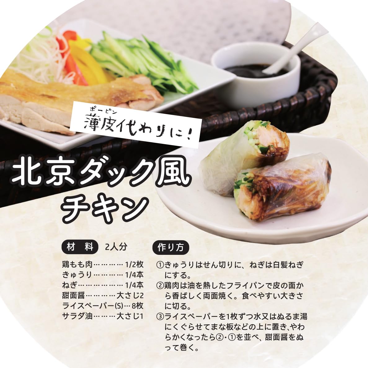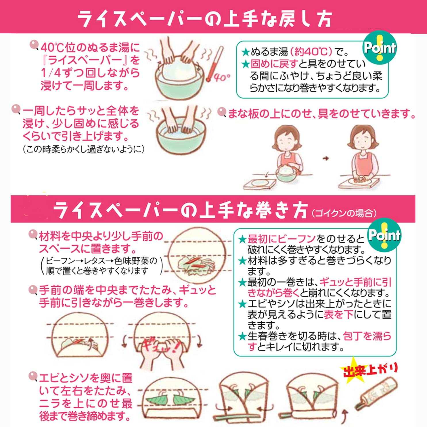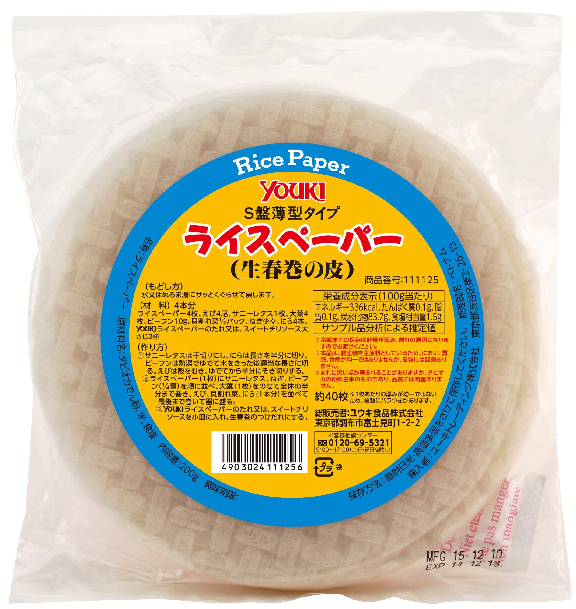 ●使用方法:(もどし方) 水又はぬるま湯にサッとくぐらせてもどします。 材料(4本分) ライスペーパー4枚、えび4尾、サニーレタス1枚、大葉4枚、新竹ビーフン10g、貝割れ菜1/2パック、白髪ネギ少々、ニラ4本、YOUKIライスペーパーのたれ又はスイートチリソース大さじ2杯 (作り方) (1)サニーレタスは千切りにし、ニラは長さを半分に切り、ビーフンは熱湯でゆでて水をきった後適当な長さに切る。えびはからをむき、ゆでてから半分にそぎ切りする。 (2)ライスペーパー(1枚)にサニーレタス、白髪ネギ、ビーフン(1/4量)を順に並べ、大葉(1枚)をのせて全体の半分まで巻き、えび、貝割れ菜、ニラ(1本分)を並べて最後まで巻いて器に盛る。 (3)YOUKIライスペーパーのたれ又は、スイートチリソースを小皿に入れ、生春巻のつけだれにする。