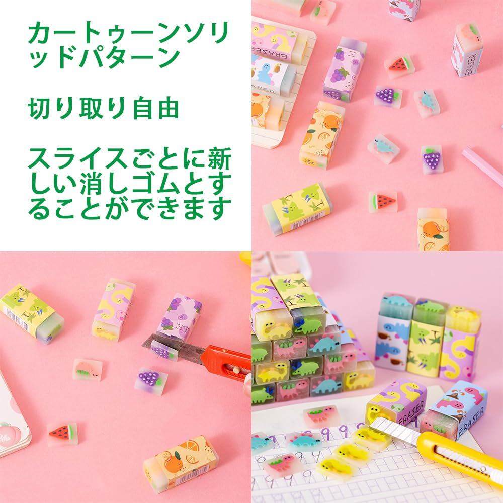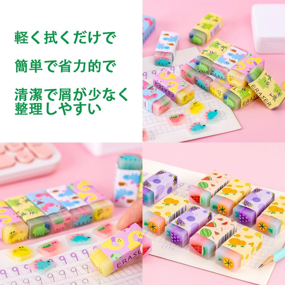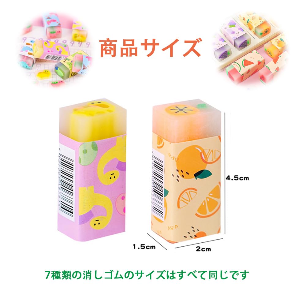 1.可愛い恐竜&フルーツデザイン 本品は表面だけでなく断面にも恐竜やフルーツのイラストが施されたユニークなデザイン。子供たちに大人気で、学習意欲を高めるのに最適です。 2.高品質PVC素材 安全で環境に優しいPVC素材を使用しており、柔らかくて耐久性が高いです。鉛筆やシャープペンの文字をきれいに消すことができ、消し心地も抜群です。 3.7個セットで便利 4.5cm×1.2cm×1.5cmのコンパクトサイズで、軽量で持ち運びに便利。7個セットなので、家庭や学校、オフィスなど、さまざまなシーンで活用できます。 4.使いやすさと実用性 消し性能が高く、紙を傷つけずにきれいに消すことが可能。消しカスも少なく、片付けが簡単です。子供から大人まで、誰でも快適に使用できます。 5.プレゼントに最適 可愛いデザインと実用性を兼ね備えており、誕生日やクリスマス、入学祝い、卒業祝いなどの贈り物としても最適です。子供たちの学習生活を楽しくサポートします。