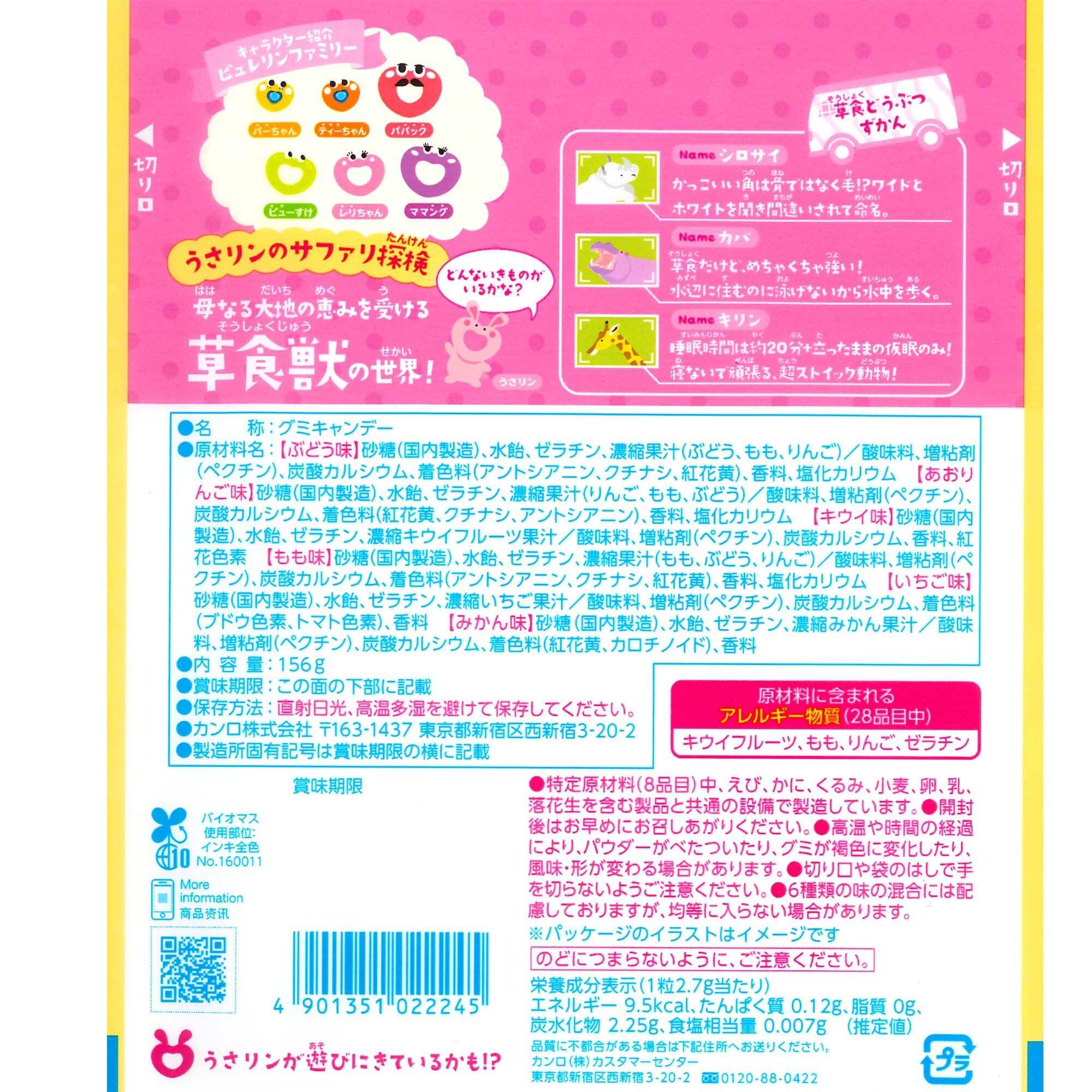 【ぶどう味】砂糖(国内製造)、水飴、ゼラチン、濃縮果汁(ぶどう、いちご、りんご)/酸味料、増粘剤(ペクチン)、炭酸カルシウム、着色料(ブドウ色素、紅花黄、クチナシ、トマト色素)、香料 【あおりんご味】砂糖(国内製造)、水飴、ゼラチン、濃縮果汁(りんご、いちご、ぶどう)/酸味料、増粘剤(ペクチン)、炭酸カルシウム、着色料(紅花黄、クチナシ、ブドウ色素、トマト色素)、香料 【パイン味】砂糖(国内製造)、水飴、ゼラチン、濃縮パインアップル果汁/酸味料、増粘剤(ペクチン)、炭酸カルシウム、紅花色素、香料 【もも味】砂糖(国内製造)、水飴、ゼラチン、濃縮もも果汁/酸味料、増粘剤(ペクチン)、炭酸カルシウム、着色料(野菜色素、クチナシ)、香料 【いちご味】砂糖(国内製造)、水飴、ゼラチン、濃縮果汁(いちご、ぶどう、りんご)/酸味料、増粘剤(ペクチン)、炭酸カルシウム、着色料(ブドウ色素、トマト色素、紅花黄、クチナシ)、香料 【みかん味】砂糖(国内製造)、水飴、ゼラチン、濃縮みかん果汁/酸味料、増粘剤(ペクチン)、炭酸カルシウム、着色料(紅花黄、カロチノイド)、香料