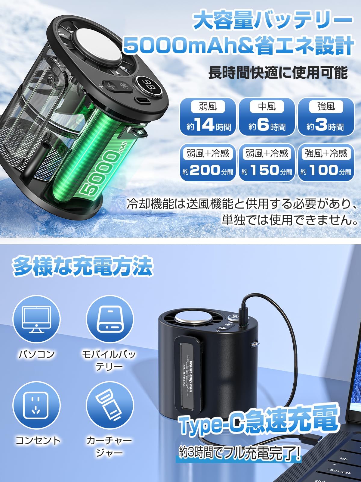 【長時間の電池寿命】5000mAhの大容量バッテリーを搭載し、最大14時間の連続使用が可能です。長時間の屋外活動やキャンプなどでも、電池切れを気にせずに使用できます。