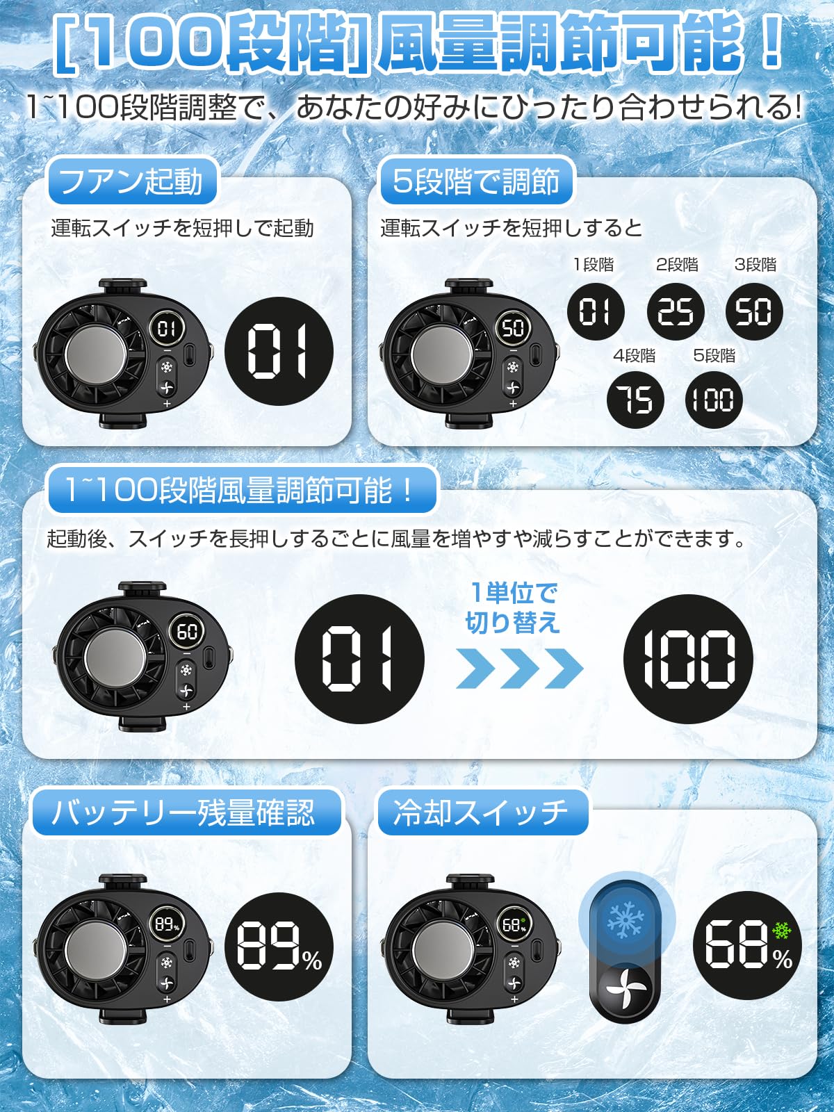 【風量調整の自由度】2種類の風量モードが搭載されています。1つ目は1〜100までの風量を無段階で調整できるモードで、微風から強風まで細かい風量の調整が可能です。2つ目は5段階の風量設定が選べるモードで、素早く風量を切り替えることができます。シーンや個人の好みに合わせて柔軟に対応できます。