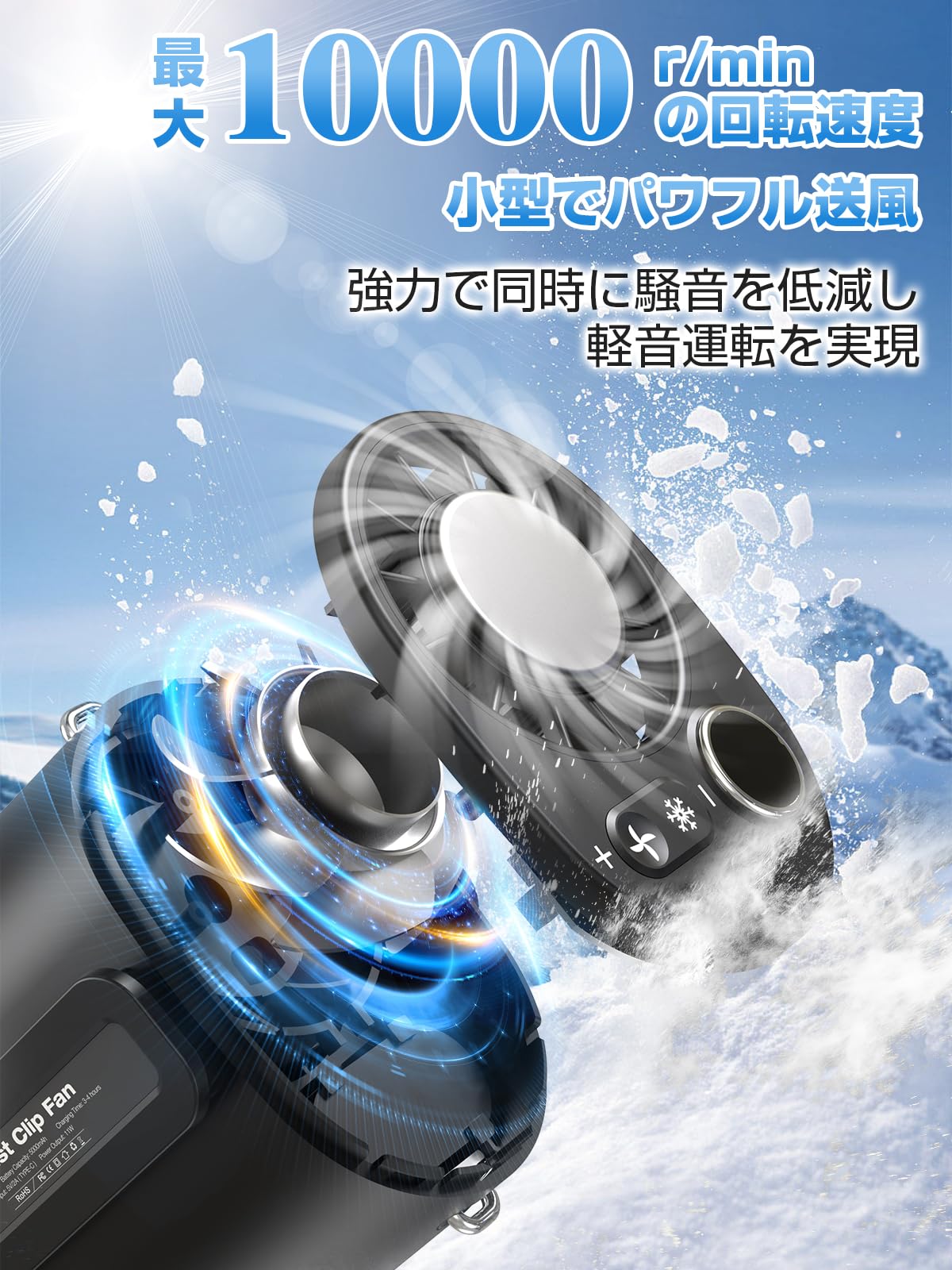 【コンパクトながら強力な風力】小型ながらも、1分間に1万回転の高速回転を実現し、強力な風を発生させます。強力な風で暑さを吹き飛ばし、快適な環境を維持します。