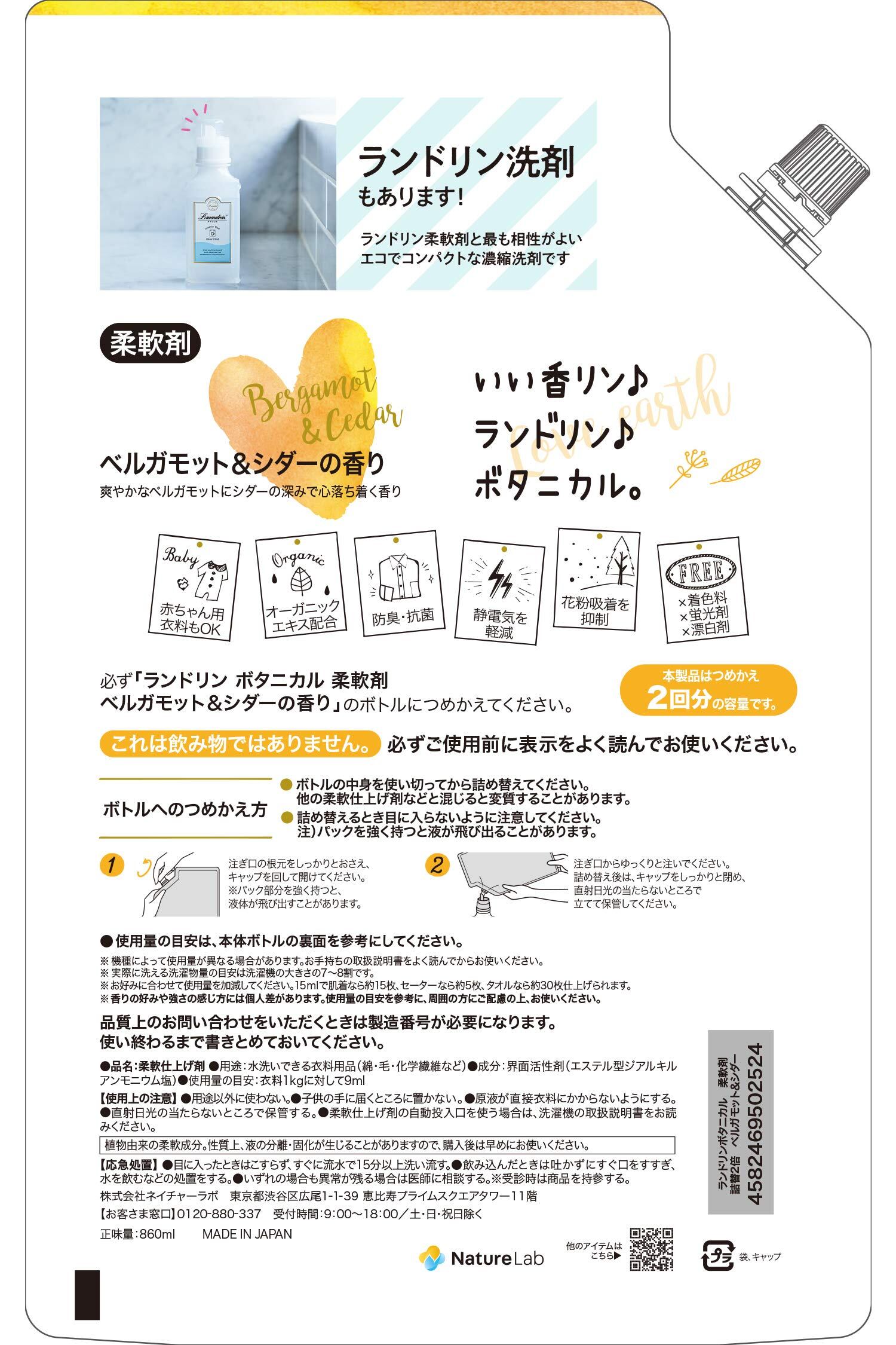 【在庫処分】Laundrin ランドリン ボタニカル 柔軟剤 大容量 ベルガモット&シダー 詰め替え 860ml オーガニック