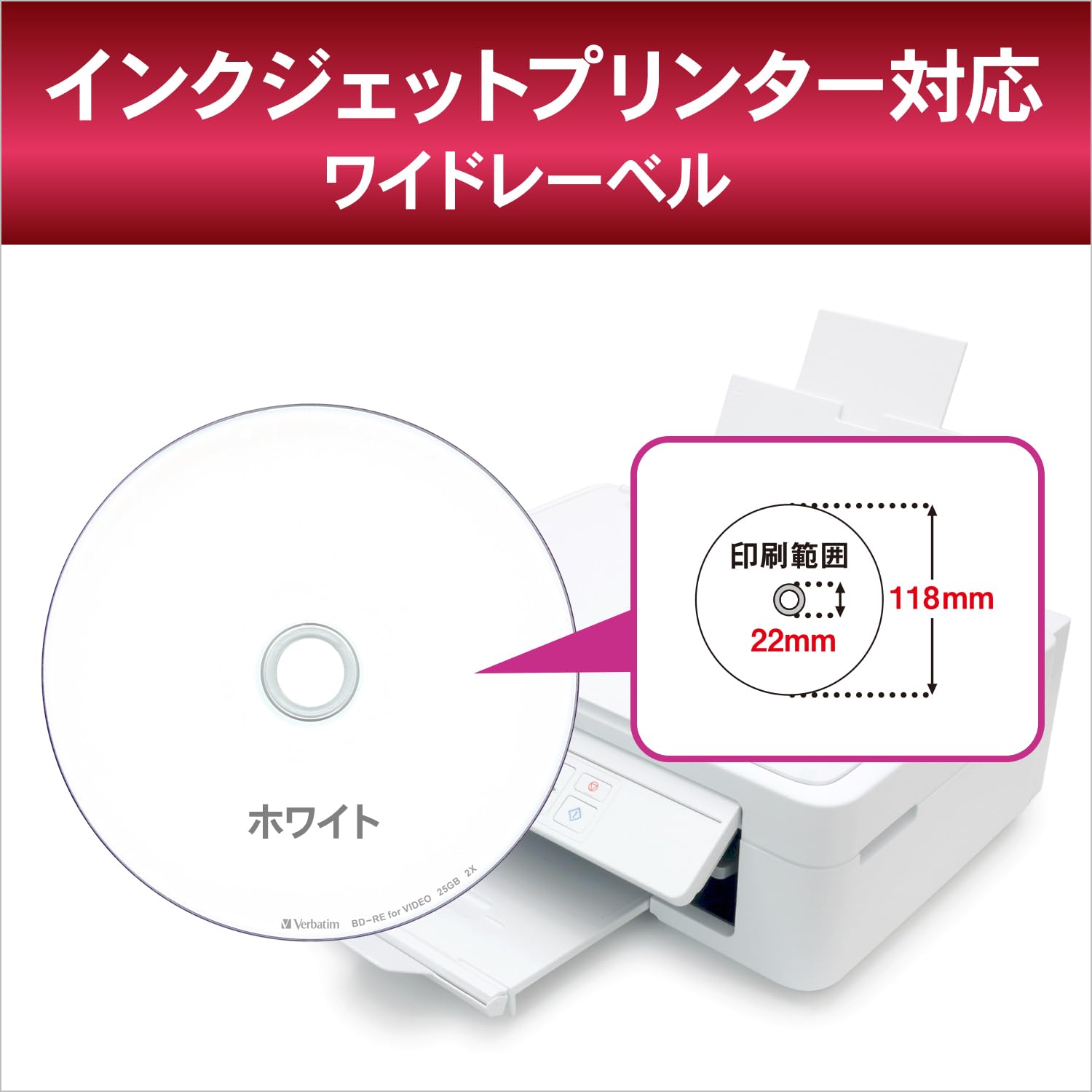 品種:録画用 BD-RE(25GB) くり返し録画用 録画時間:地デジ 180分 / BSデジタル130分 盤面印刷:○(ホワイト) / 範囲:22mm-118mm(ワイド) 倍速:1-2倍速,ケース:スピンドルケース,入り数:50枚 インクジェットプリンタ対応