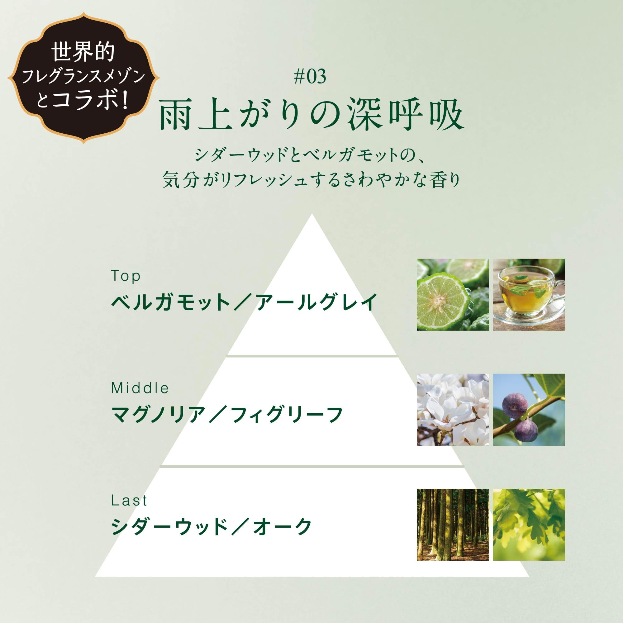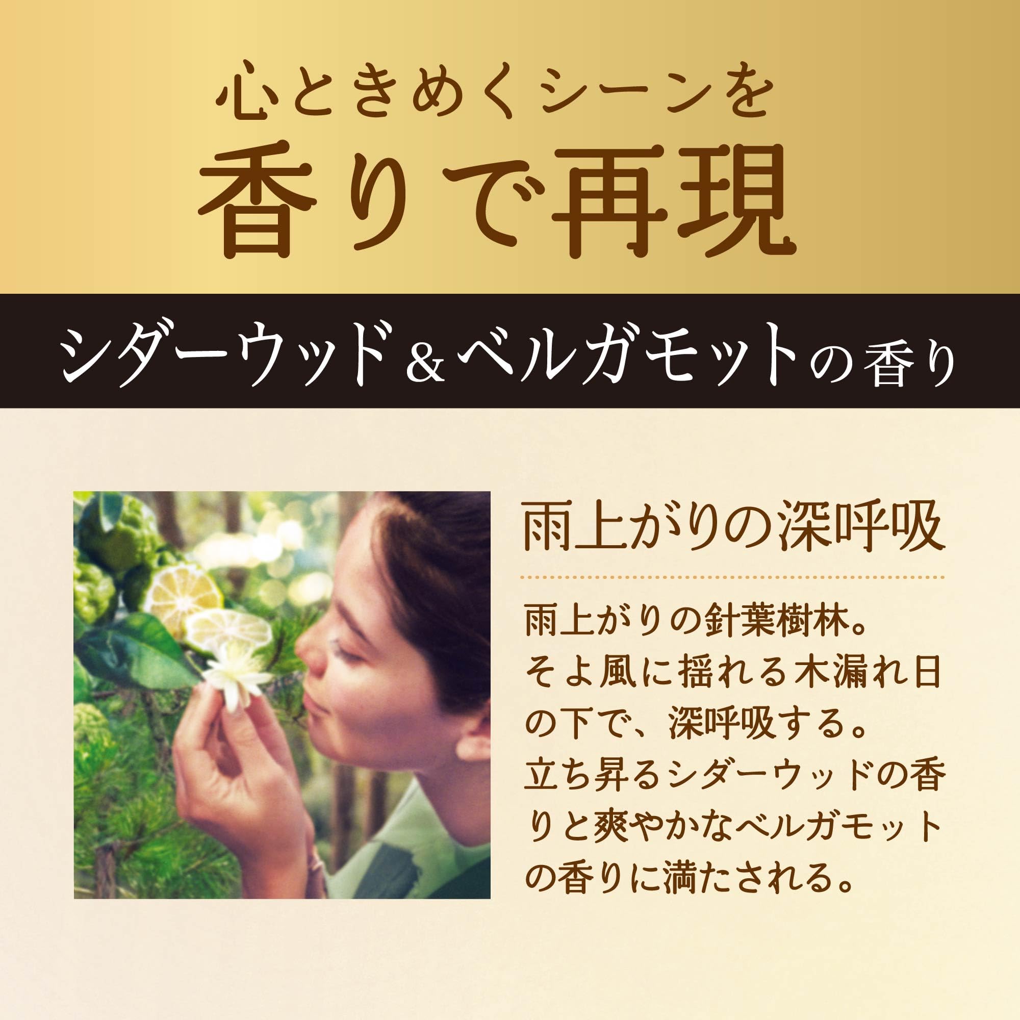 シダーウッド&ベルガモットハーブの香り。心ときめくシーンを香りで再現 雨上がりの深呼吸:雨上がりの針葉樹林。そよ風に揺れる木漏れ日の下で、深呼吸する。立ち昇るシダーウッドの香りと爽やかなベルガモットの香りに満たされる。
