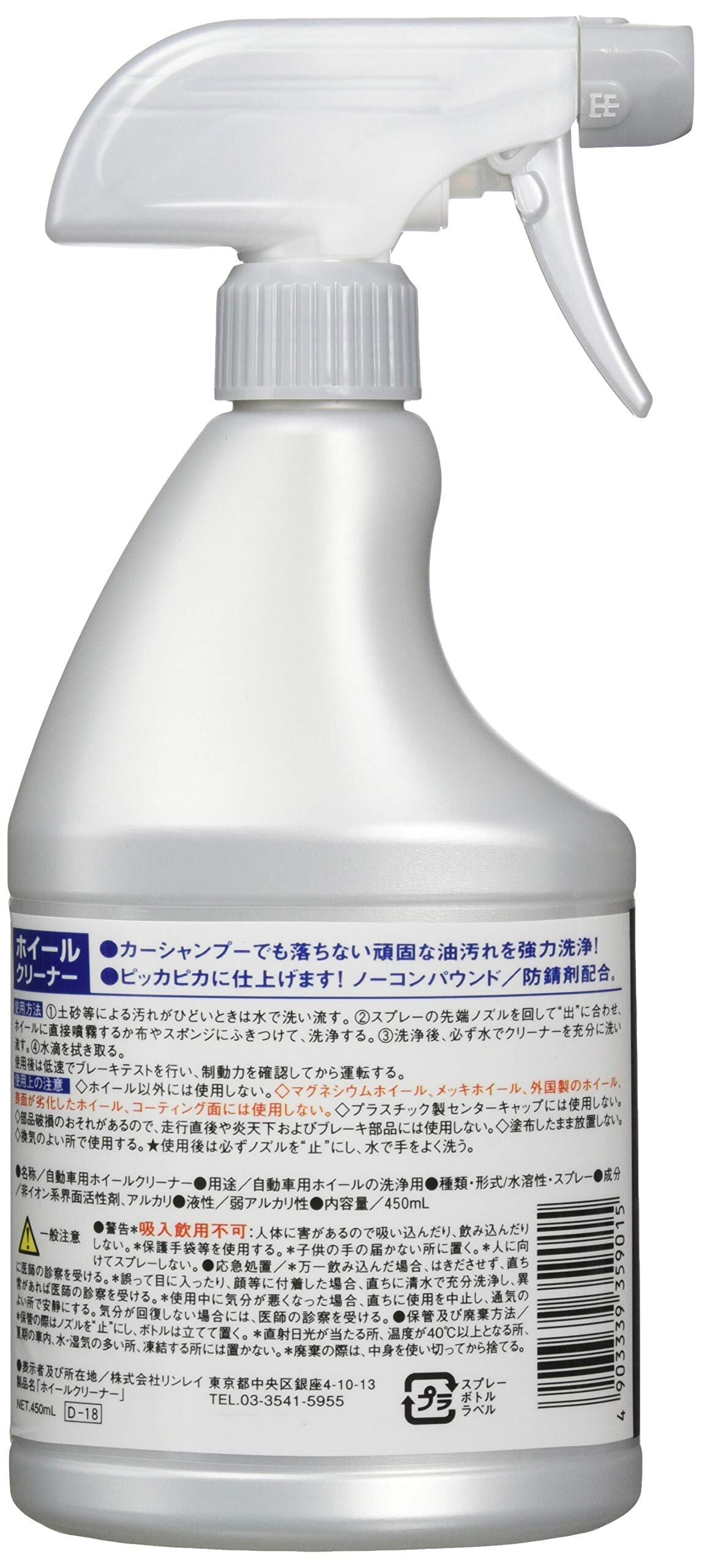 RINREI(リンレイ) ホイールクリーナー ホイールクリーナー D-18 生産国:日本 【内容量】450ml 種類: 単品 パッケージ重量: 0.55 kg ●ガンコなピッチ汚れ、ブレーキダストを強力に洗浄します。 ●タレ落ちにくい粘調フォームタイプ。 ●防錆剤配合。 使用上の注意 ※マグネシウムホイール、メッキホイール、外国製のホイール、表面が劣化したホイール、コーティング面には使用しないでください。