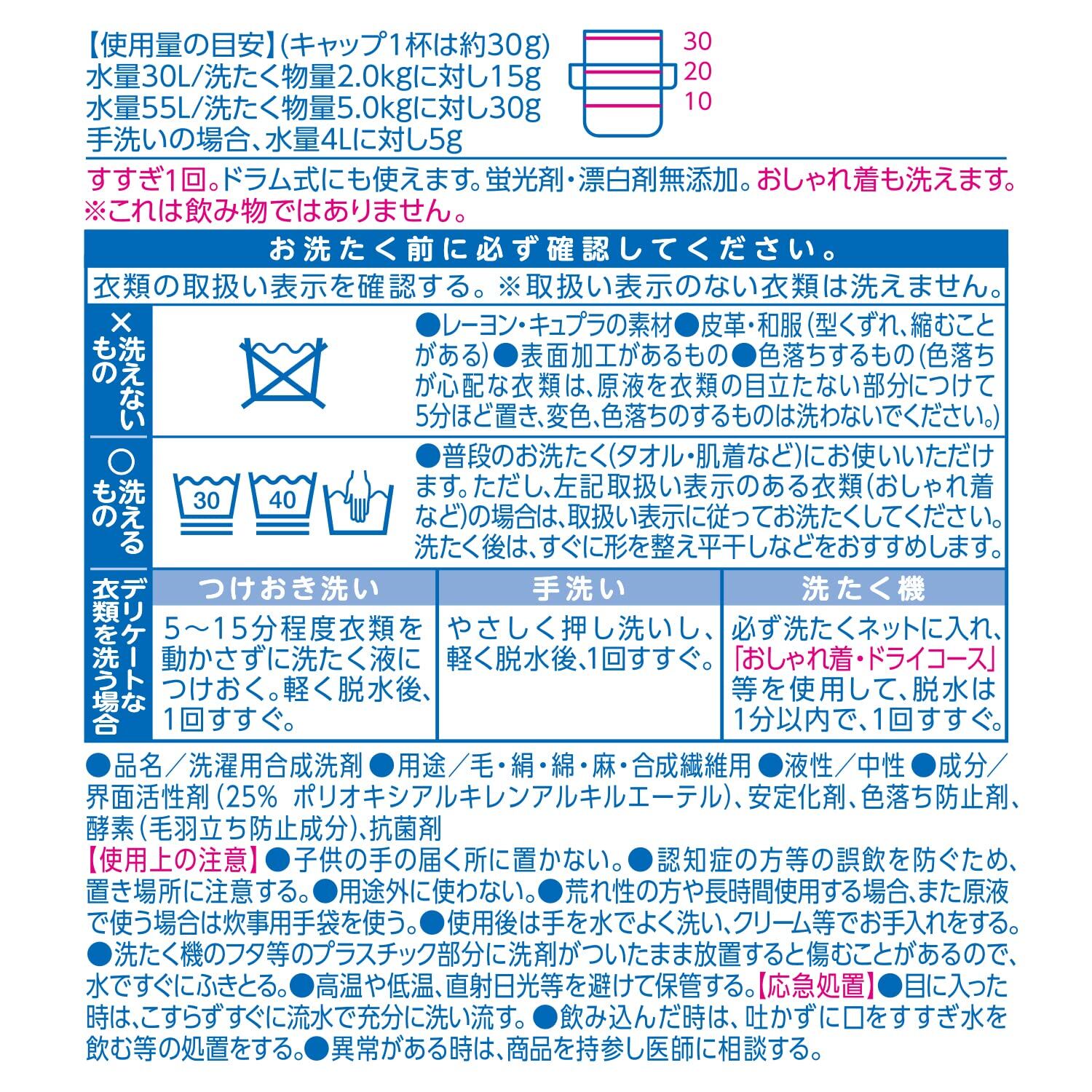 界面活性剤(25% ポリオキシアルキレンアルキルエーテル)、安定化剤、色落ち防止剤、酵素(毛羽立ち防止成分)、抗菌剤