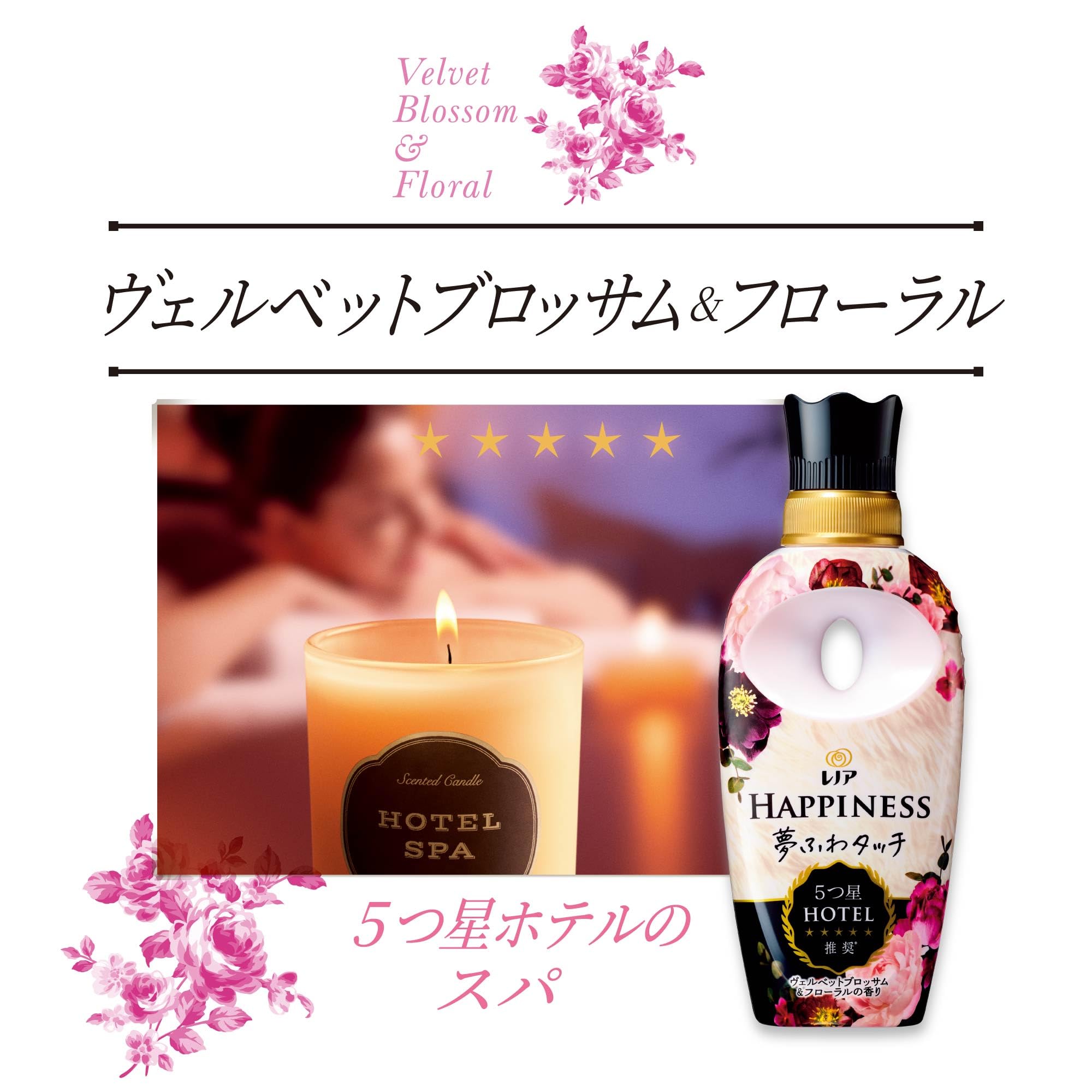 レノアハピネス夢ふわタッチなら5つ星ホテルも認める贅沢な香りが1週間*楽しめます。(*保管状態にて) ヴェルベットブロッサム&フローラルの香りは、ピンクフローラルとバニラが織りなす魅惑の香り。