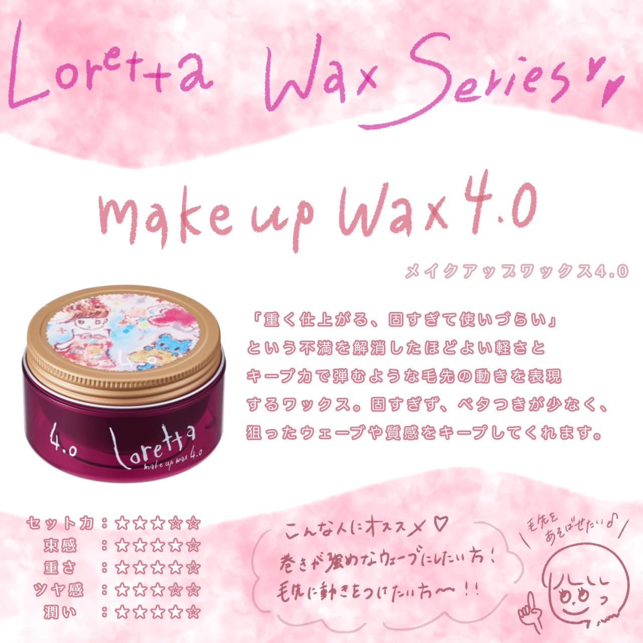 【在庫のみ】ロレッタ メイクアップワックス 4.0 [ヘアワックス ロング セミロング ミディアム パーマ ウェーブ 巻き髪 カールキープ 前髪キープ まとめ髪 アレンジ スタイリング やわらかめ 固まらない]
