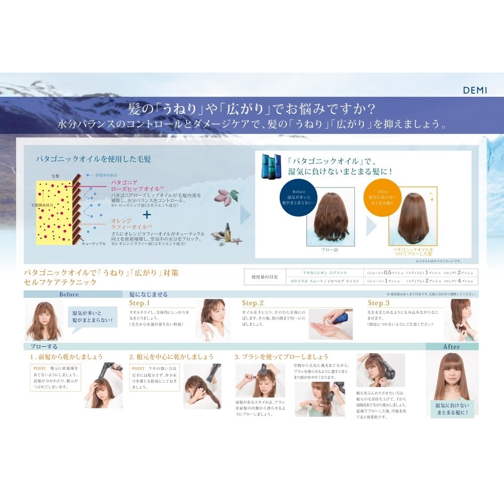 適量を手のひらでよく伸ばし、髪に塗布しスタイルを整えます。