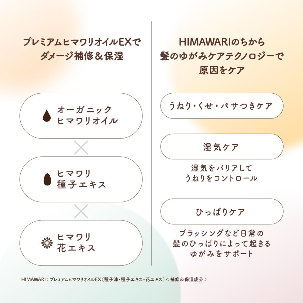 ??【髪のゆがみとは?】髪がパサつく、ハネ・うねりが出やすいなど、30代から感じ始める髪質の変化は、髪内部と外側それぞれの脂質と水分バランスの乱れ(=髪のゆがみ)が原因。ディアボーテHIMAWARIに配合された「プレミアムヒマワリオイルEX*」が、これらのバランスを整え、うねり・くせ・パサつきの原因となる髪のゆがみをケア。*オーガニックヒマワリオイル、ヒマワリ種子エキス、ヒマワリ花エキス