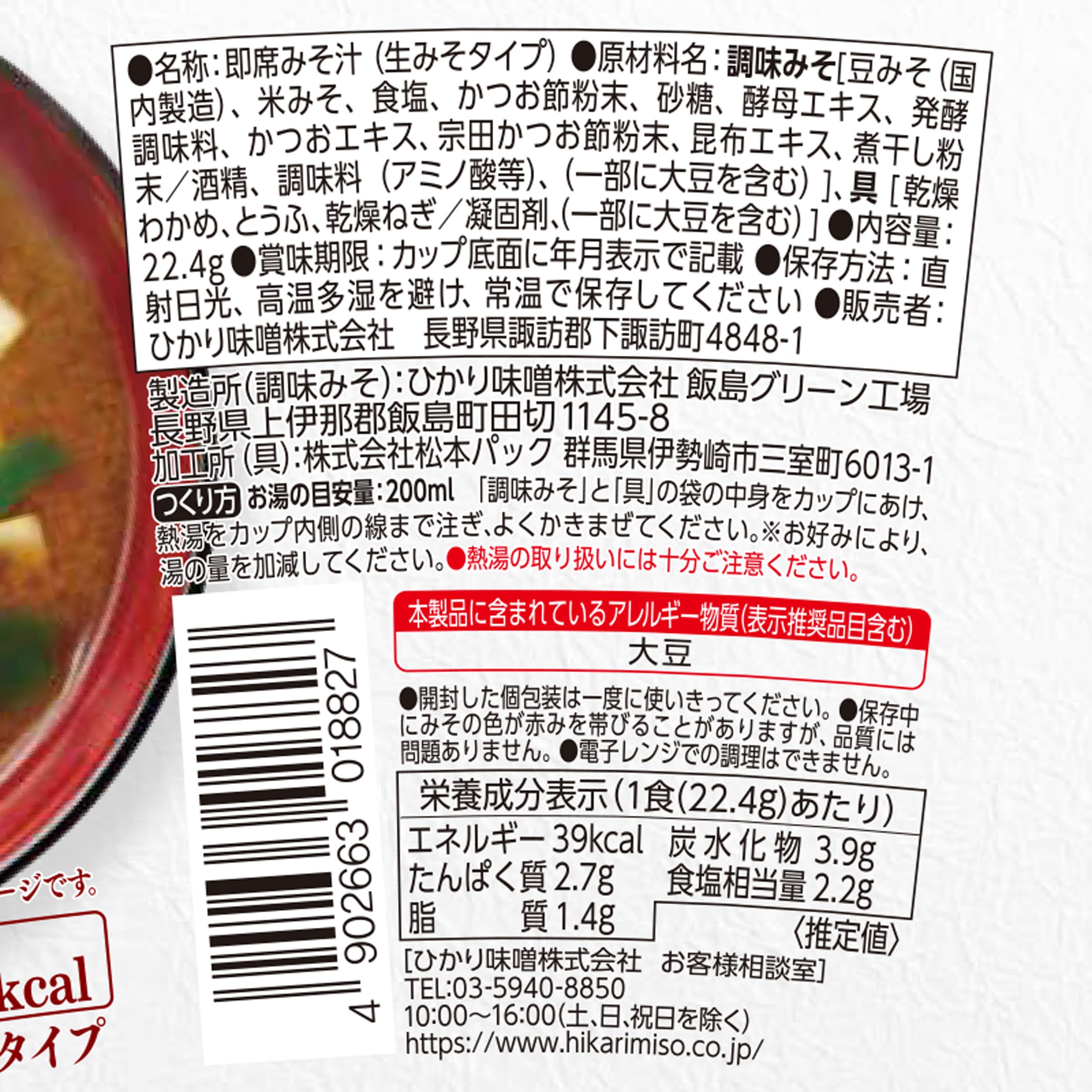 調味みそ[豆みそ(国内製造)、米みそ、食塩、かつお節粉末、砂糖、酵母エキス、発酵調味料、かつおエキス、宗田かつお節粉末、昆布エキス、煮干し粉末/酒精、調味料(アミノ酸等)、(一部に大豆を含む)]、具[乾燥わかめ、とうふ、乾燥ねぎ/凝固剤、(一部に大豆を含む)]