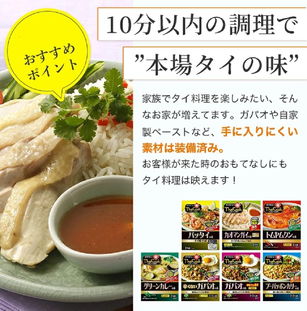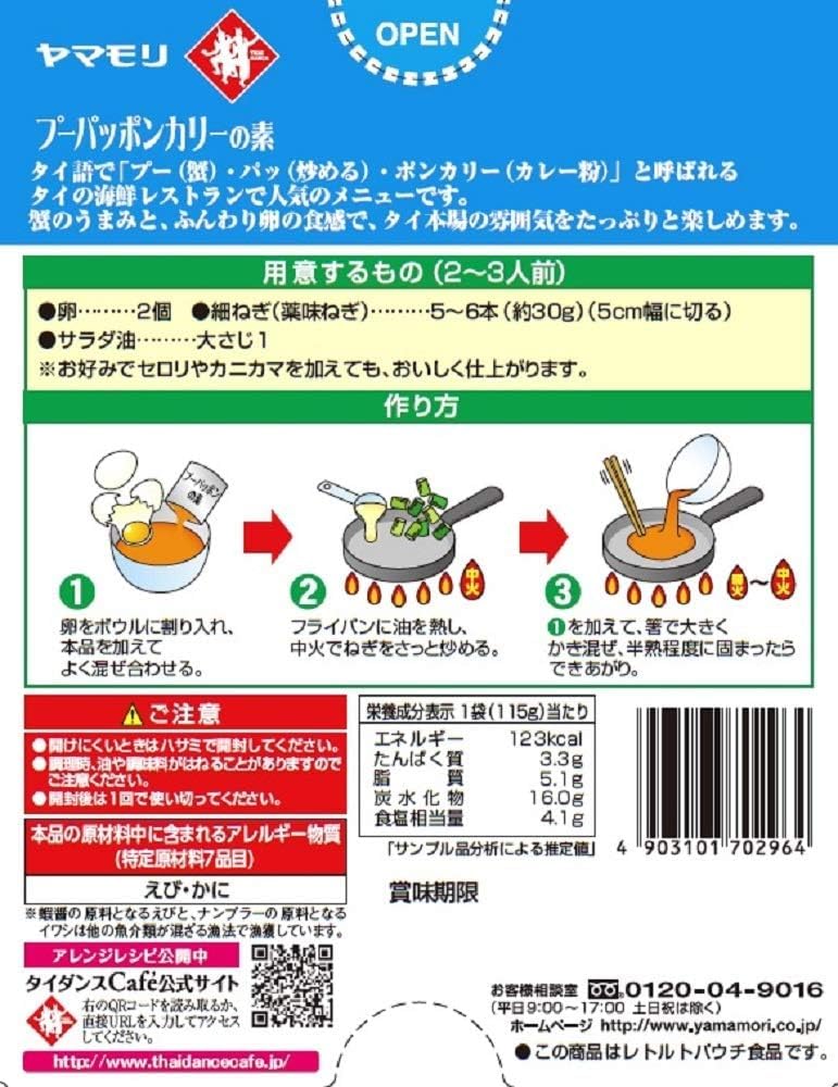 原材料:ナンプラー、チリペースト(大豆油、干しえび、唐辛子、玉ねぎ、にんにく、タマリンド、砂糖、食塩、えびペースト)、にんにく、砂糖、香味油(えび・かにを含む)、香辛料、大豆油、カレー粉、かに、蝦醤(えびを含む)、かに殻パウダー、オイスターソース(大豆を含む)/増粘剤(加工でん粉、キサンタン)、調味料(アミノ酸等)、酸味料、パプリカ色素、カラメル色素