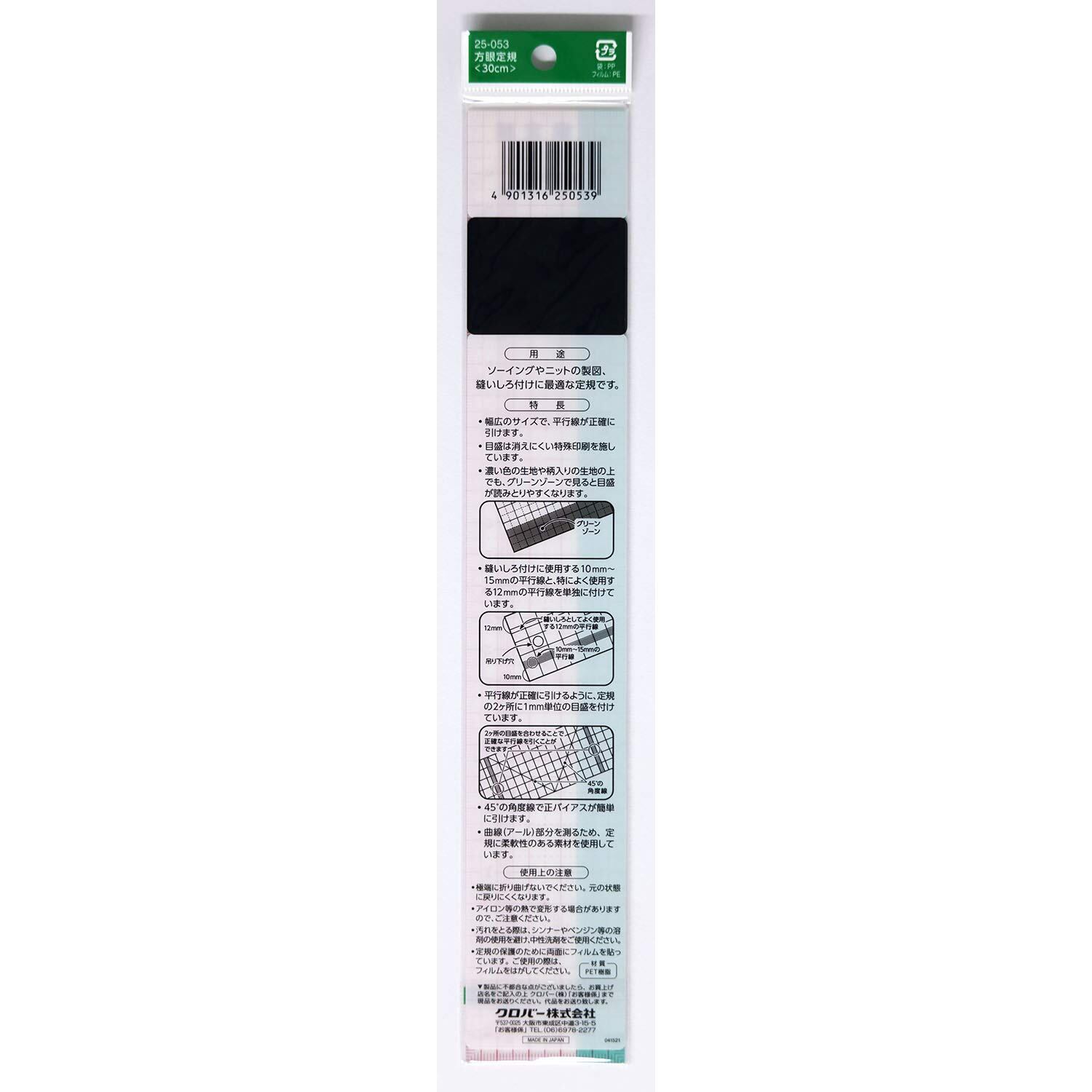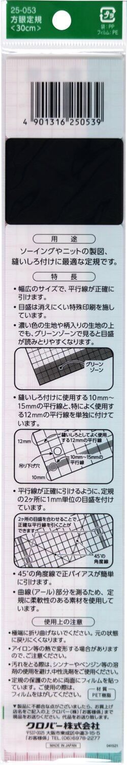 クロバー(Clover) 方眼定規 30cm 25-053 対象性別 :男女共用 色: クリア 種類: 単品 素材: プラスチック 適度な柔軟性を持つソーイング定規です。 濃い色の布の上でも目盛りが見やすく、45度の角度線で正バイアスを手軽に引くことができます。