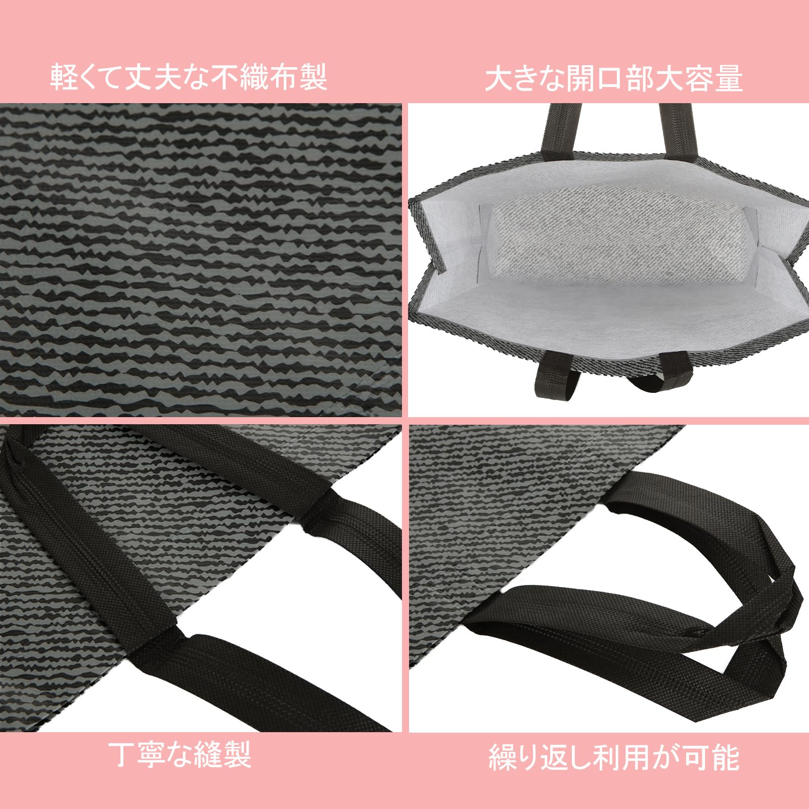 丈夫で軽量:不織布バッグは厚手で強い荷重にも耐えられて、大きめな荷物でも持ち運びがラクラクです。A4サイズがすっぽり入るサイズ、丈夫なので重めのファイルも入れることができます。