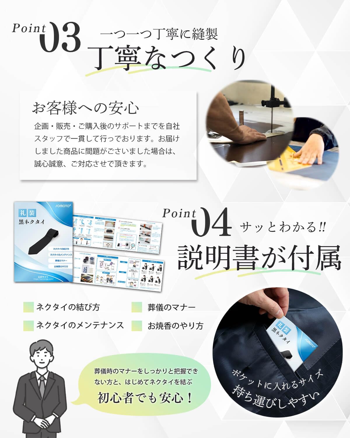 『厚労省認定 葬祭のプロが監修』厚労省認定 葬祭ディレクター1級 田中直氏がプロ監修したフォーマル黒ネクタイです。SOMOTO 葬式 ネクタイは他社製と比べ光沢が少ない黒ネクタイです。ポリエステル100%で水や汗に強く、シワになりにくい素材のため、形が崩れることが少なく、葬儀に参列する際に最適です。またネクタイの結び方や葬儀マナーの冊子を同梱しております。いざという葬儀参列においてネクタイと共にお役立ていただけます。