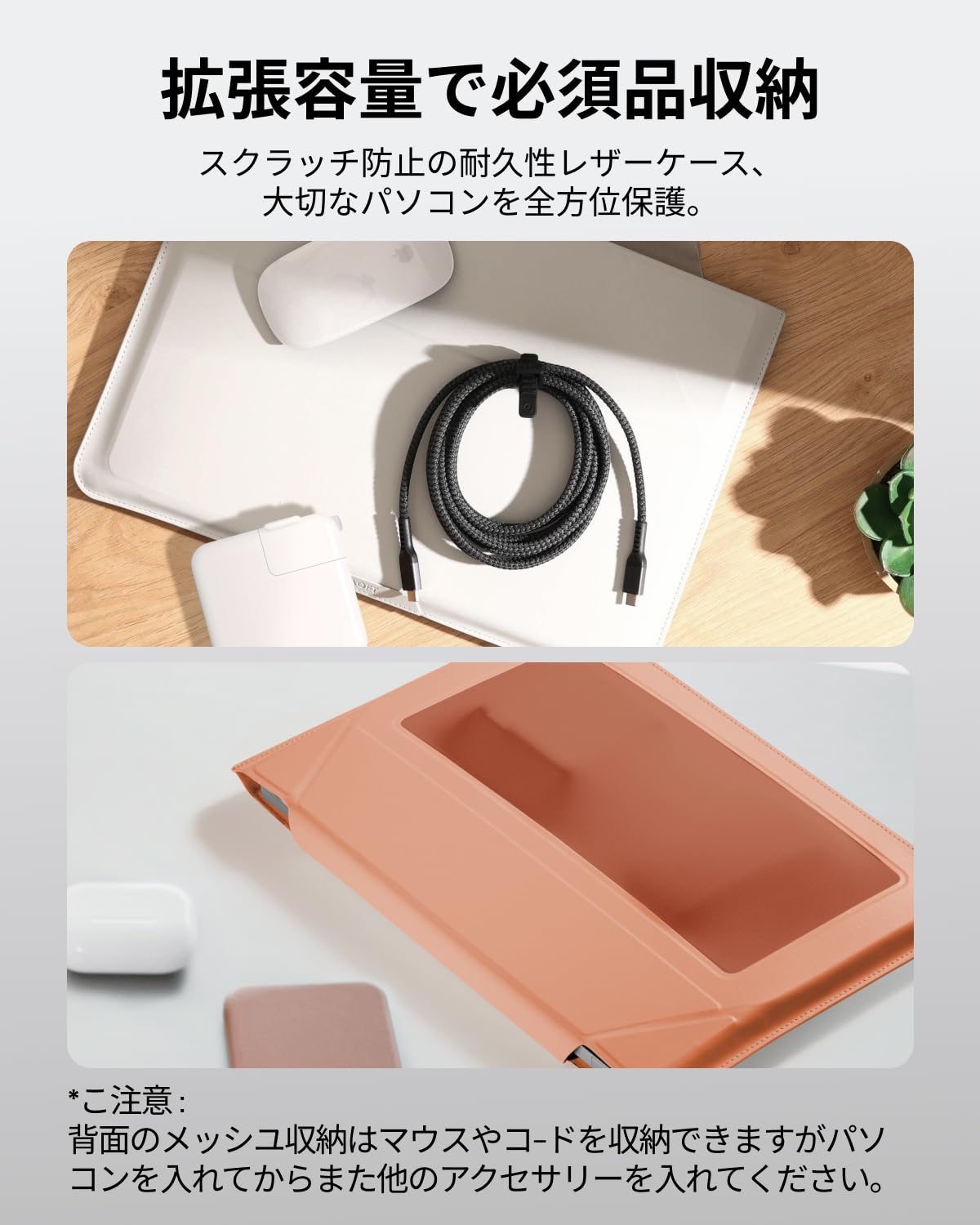 【特製の上質ヴィーガンレザー】従来のレザーに比べ約30%薄く、繊細な質感が特長です。耐久性にも優れ、温かく柔らかな手触りで、快適な持ち運びを実現します。さらに、撥水機能により、突然の雨や飲みこぼしから大切なノートPCを守ります。(本製品は完全防水ではありません。液体に浸したり、開口部から水分が浸入したりする状況には対応しておりませんので、ご注意ください。)