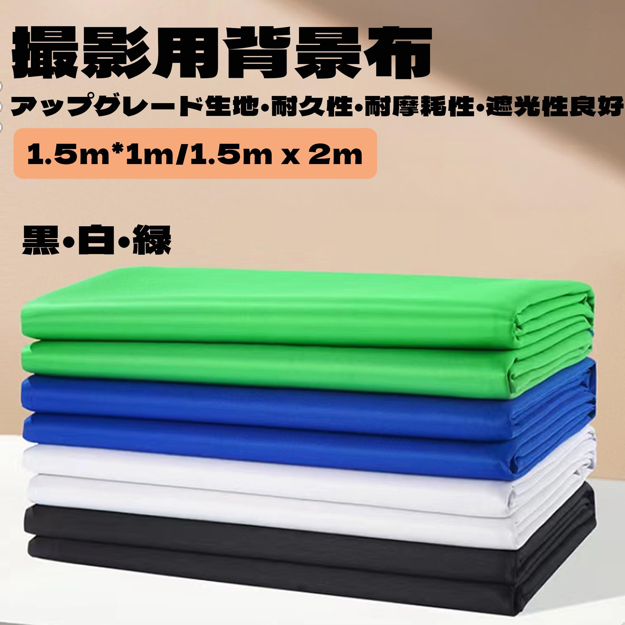【製品仕様】背景布 白い布 1枚を含むセットです。サイズ:1.5m×1m/1.5m×2mから選択可能。カラー:黒/白/緑の中からお好みの色をお選びいただけます。※背景布 撮影は耐久性に優れ、適切に保管すれば繰り返しご使用いただけます。黒色の背景布は、ホームフォト、スタジオ撮影、イベント装飾などでよくご利用いただいております。