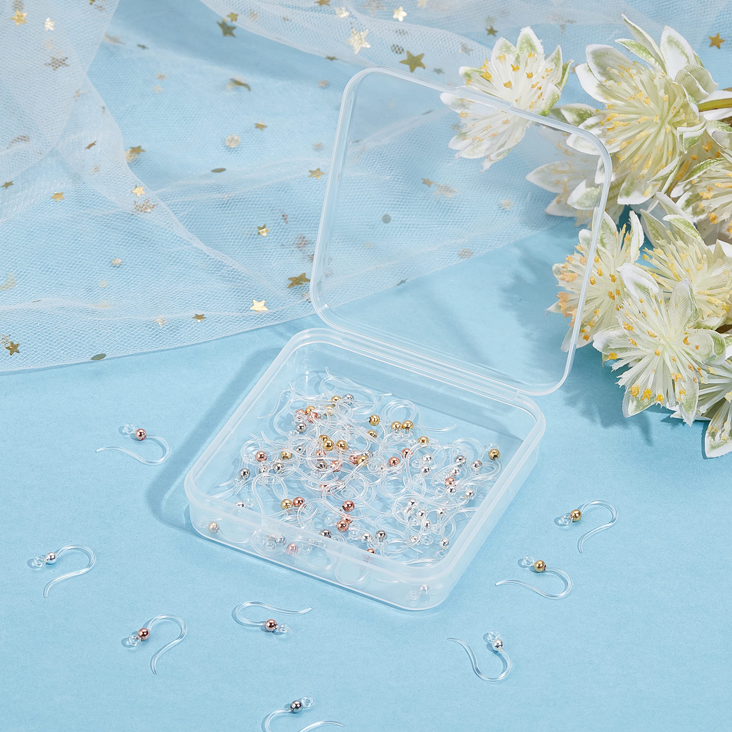 SUNNYCLUE 1箱80個4色 プラスチック イヤリング フック イヤリングフック パーツ プラスチック ピアス フック ピアスフック パーツ イヤリングパーツ フック イヤリング パーツ ピアスパーツ フック ピアス パーツ ピアス 金具 ピアス 丸玉付き 304ステンレス 透明色 ピアスフック パーツ シルバー ゴルドー イヤリング 釣針ピアス パーツ ジュエリー U型 ピアスパーツ ステンレスボール付き 樹脂ピアス イヤワイヤー プラスチック ピアスピン 釣針 イヤクリップ アクセサリーパーツ 手作り素材 DIY材料 手作り ハンドメイド イヤリングフック カン付き クラフト用品 手芸用品 ジュエリー用 アクセサリーパーツ