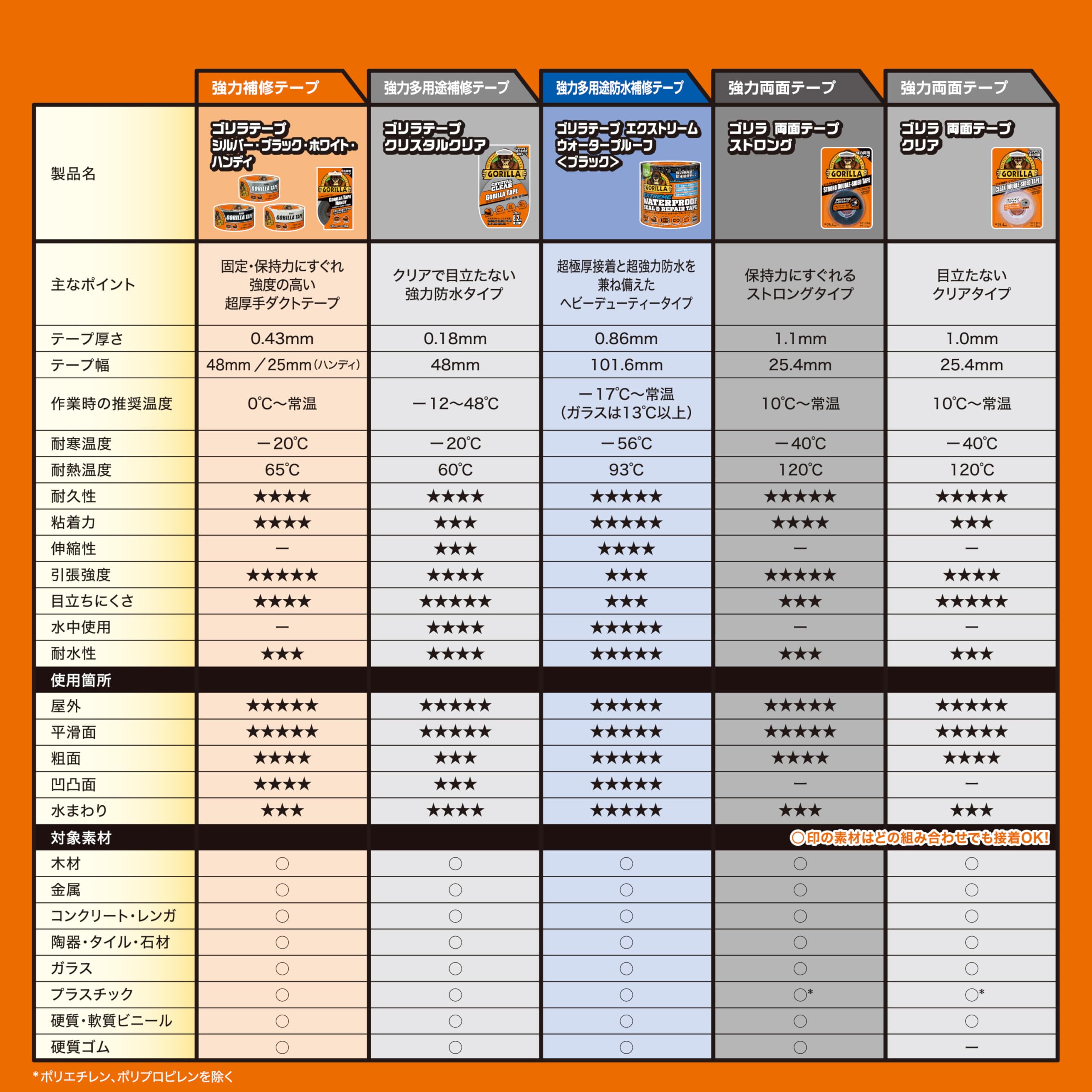 ※EPDMゴムなどの油分の含有量が多い素材には貼り付かない場合があります。