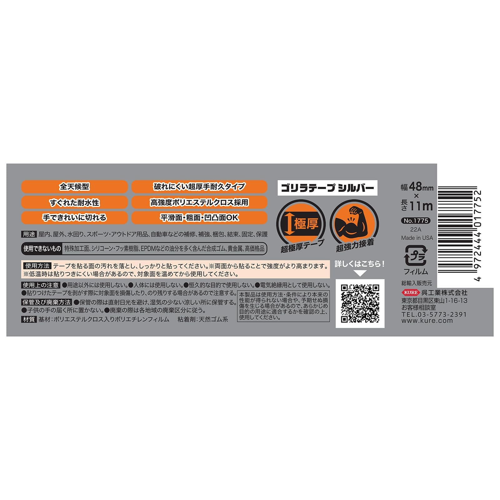 【数量限り】KURE(呉工業) ゴリラテープシルバー 48mm×11m 強力補修テープ 1775