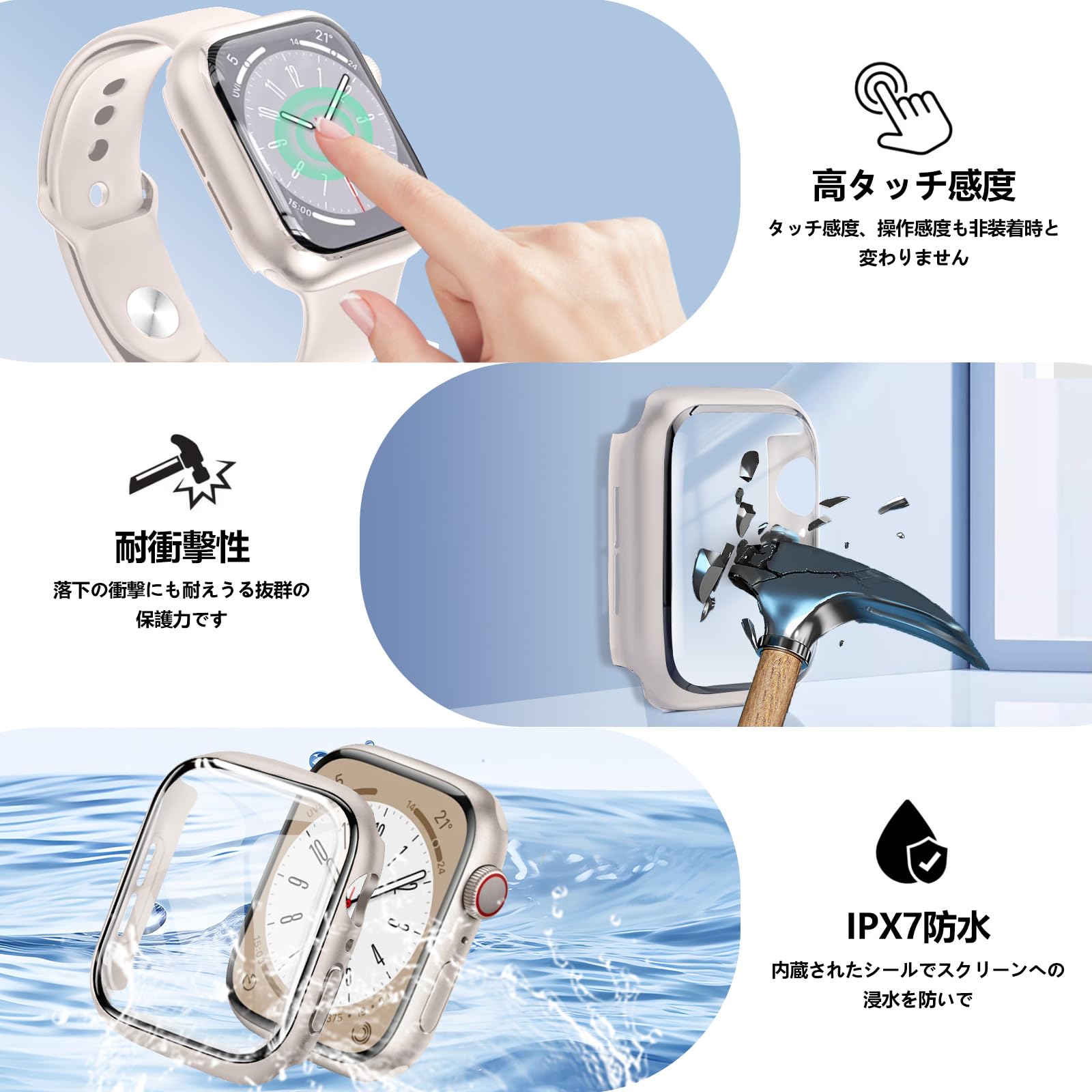 【防水・防塵】シーリングリング内蔵したApple Watchケース、Apple Watchの画面にぴったりとフィットし、水の浸入を防ぎます。ほこりを完全に防ぎ、ケースを取り外して水を拭くすることを繰り返す必要はありません。疎水性撥油性抜群の強化ガラス表面により、カバー面に水が溜まらず、シャワー、手洗い、発汗、運動、雨など、日常の使用に適しています。(ご注意:ダイビングなどの深層水耐性には適しません。)